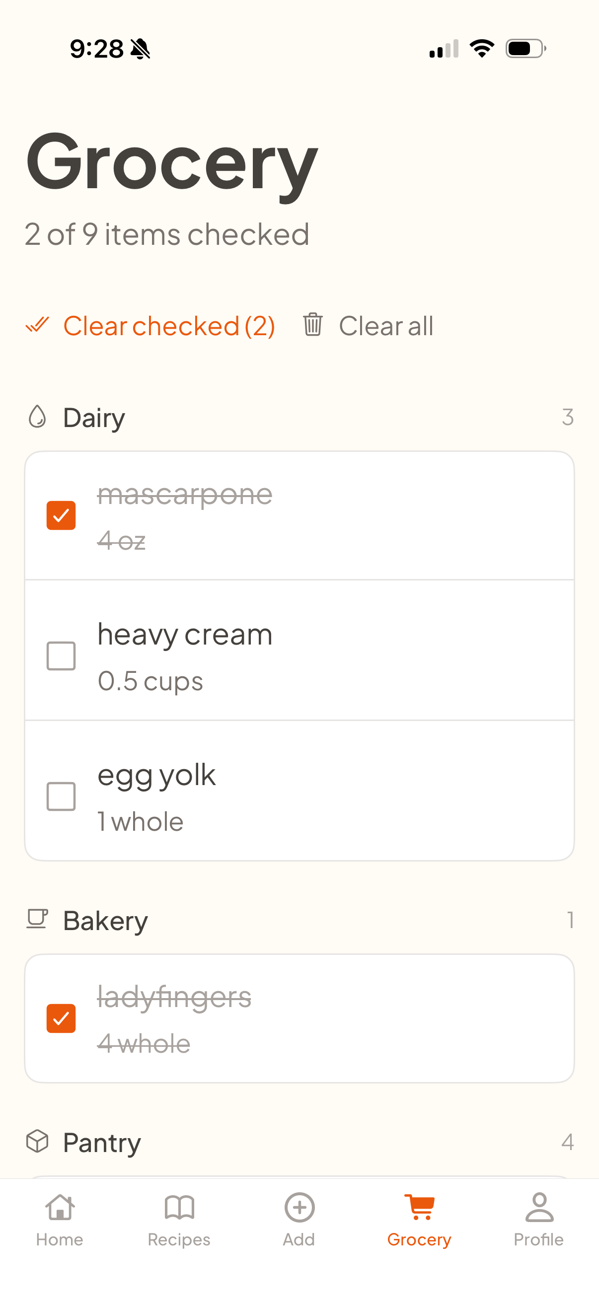 - Grocery list - One tap adds ingredients sorted by aisle, so you know exactly what to buy.