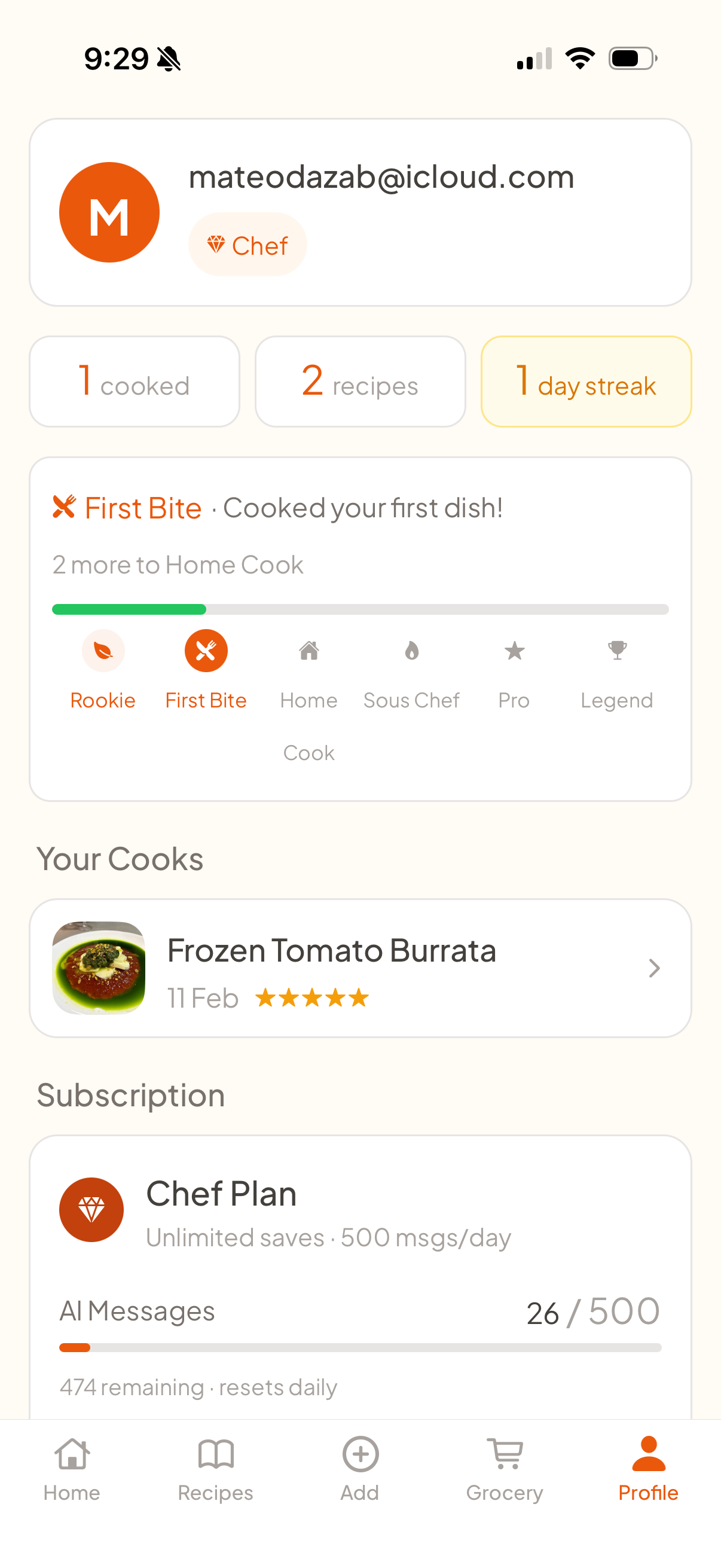 Chef subscription unlocks unlimited imports, 500 messages/day, and recipe memory.