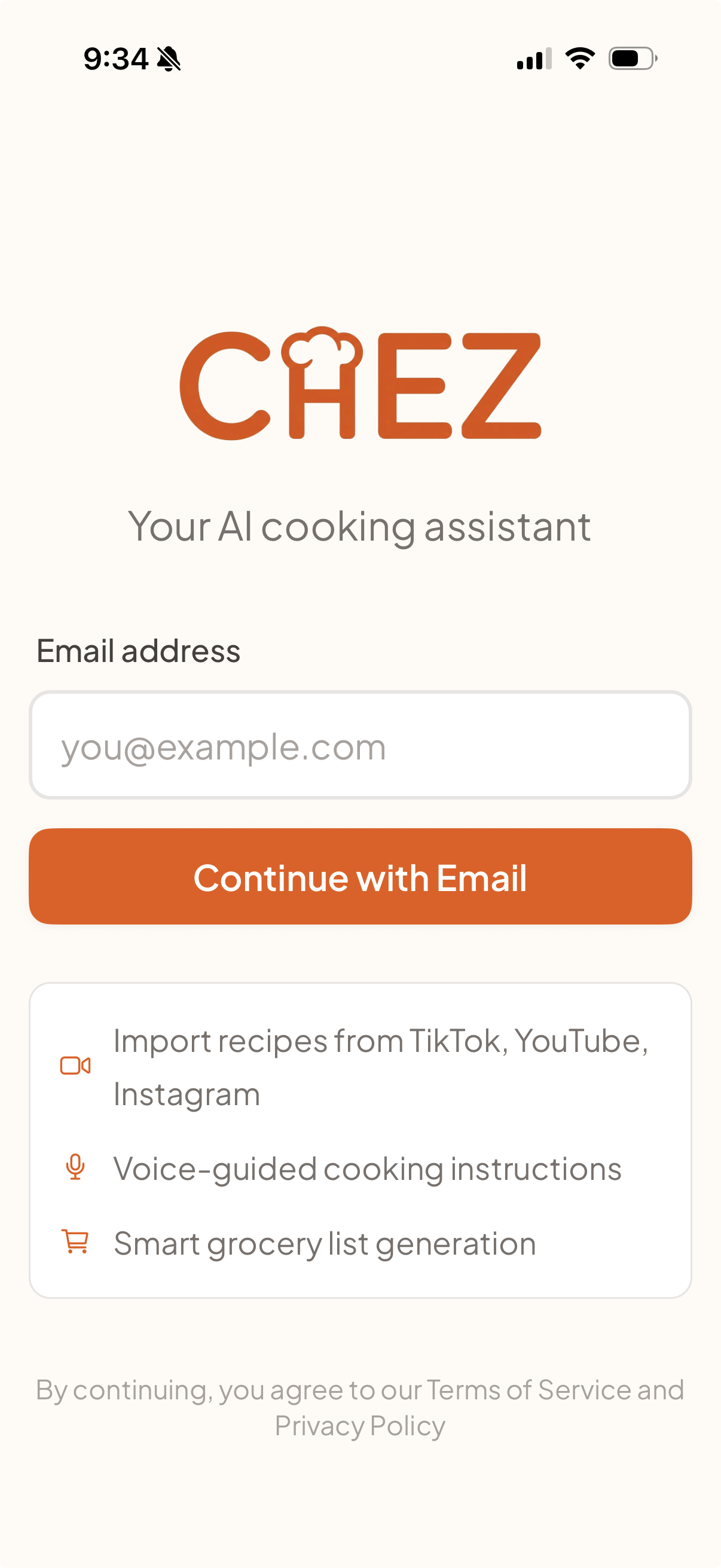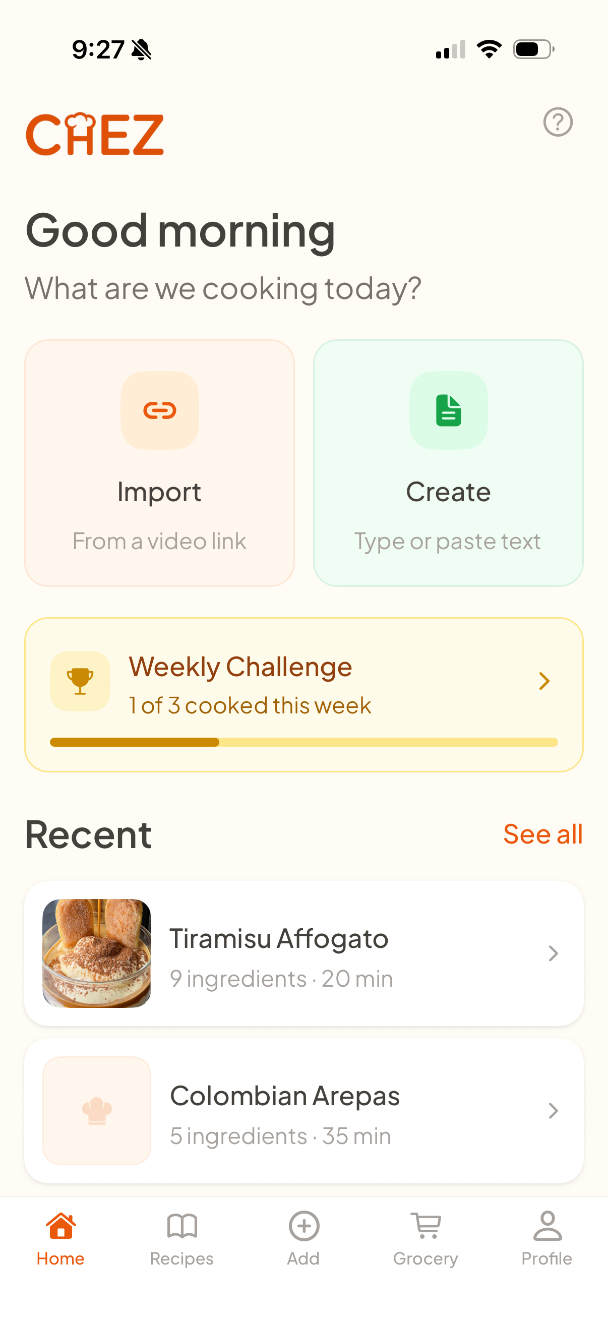 - Import - Paste a TikTok, Instagram, or YouTube link. Chez extracts ingredients, steps, and timing automatically. Or type a recipe from scratch.