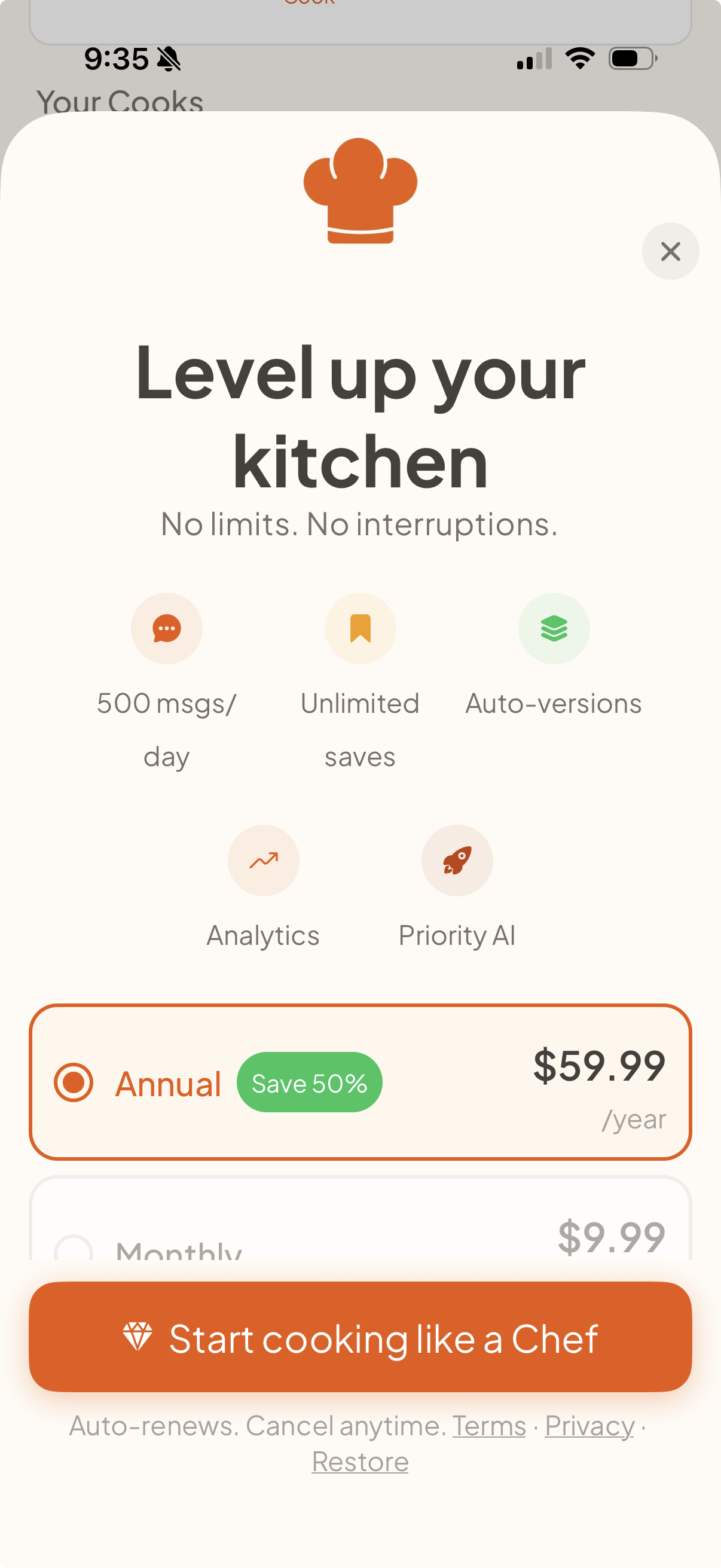 The freemium model gives everyone 20 messages a day and 3 imports a month. Chef unlocks 500 AI messages/day, unlimited imports, and personalized cooking memory. The paywall surfaces naturally after your last free message, not before, so it never blocks you from finishing a cook.