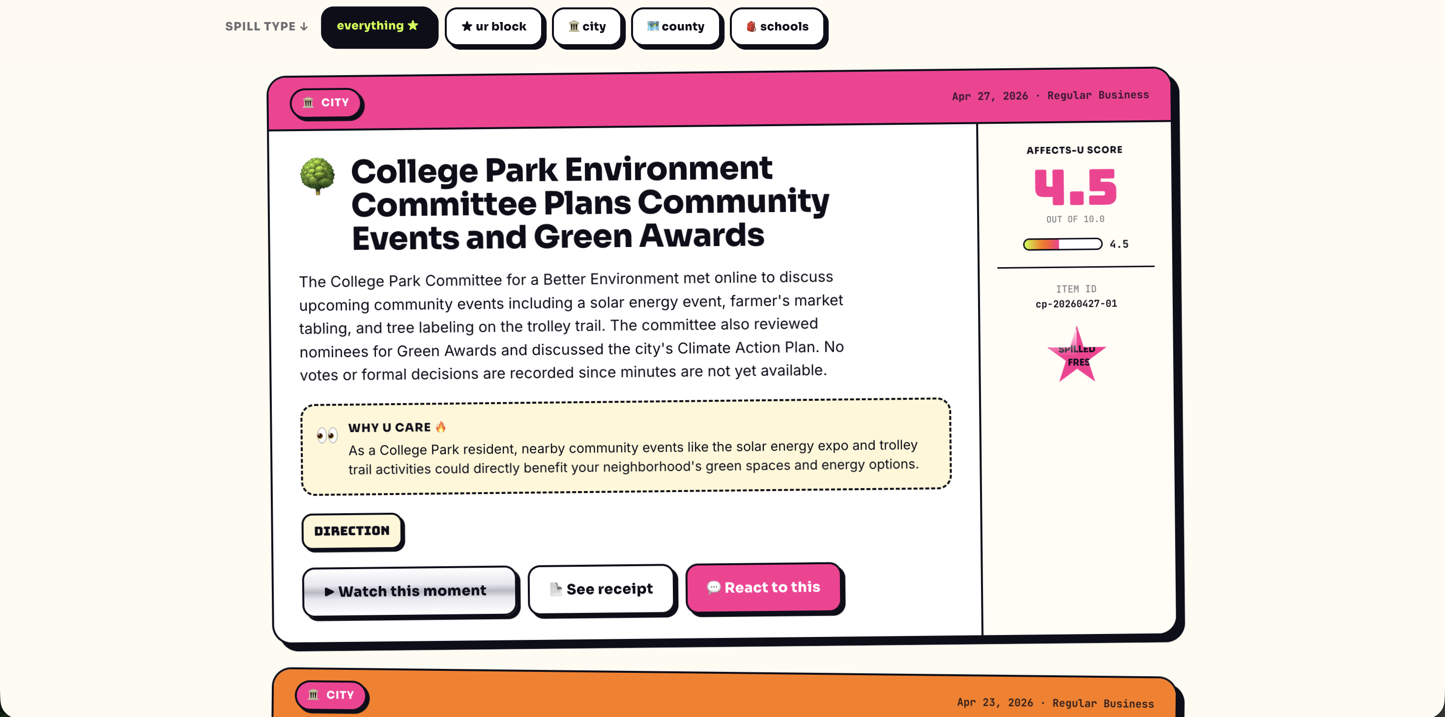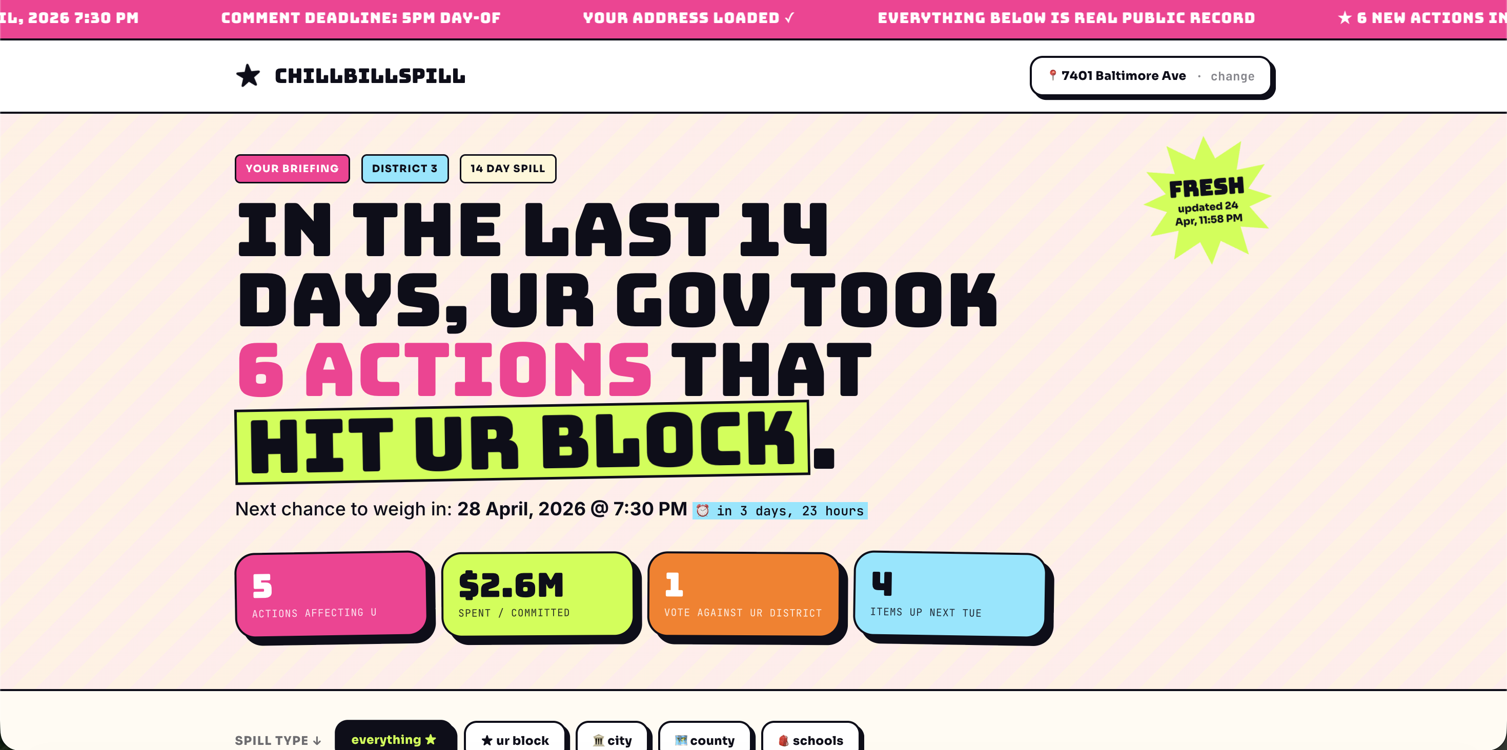 ChillBillSpill turns real local government records into a personalized, source-backed civic briefing. A resident enters their address and gets a fast summary of recent city, county, and school decisions that affect them.