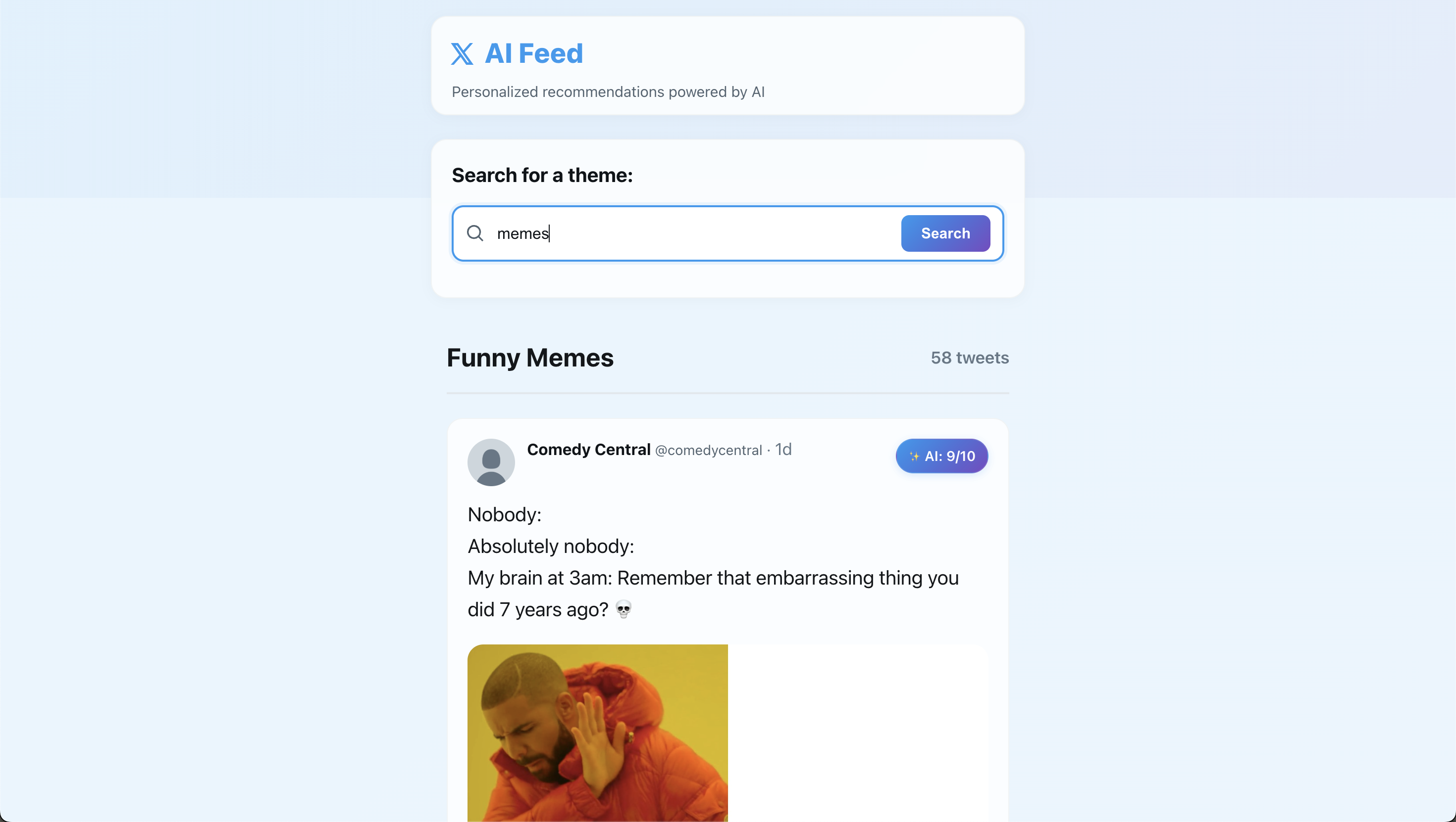 This project curates a personalized Twitter (X) feed based on user-selected themes like Productivity, Work-Life Balance, or Memes. Instead of relying on opaque engagement metrics, it analyzes tweets based on their meaning and tone to decide which ones best fit a user’s chosen theme.