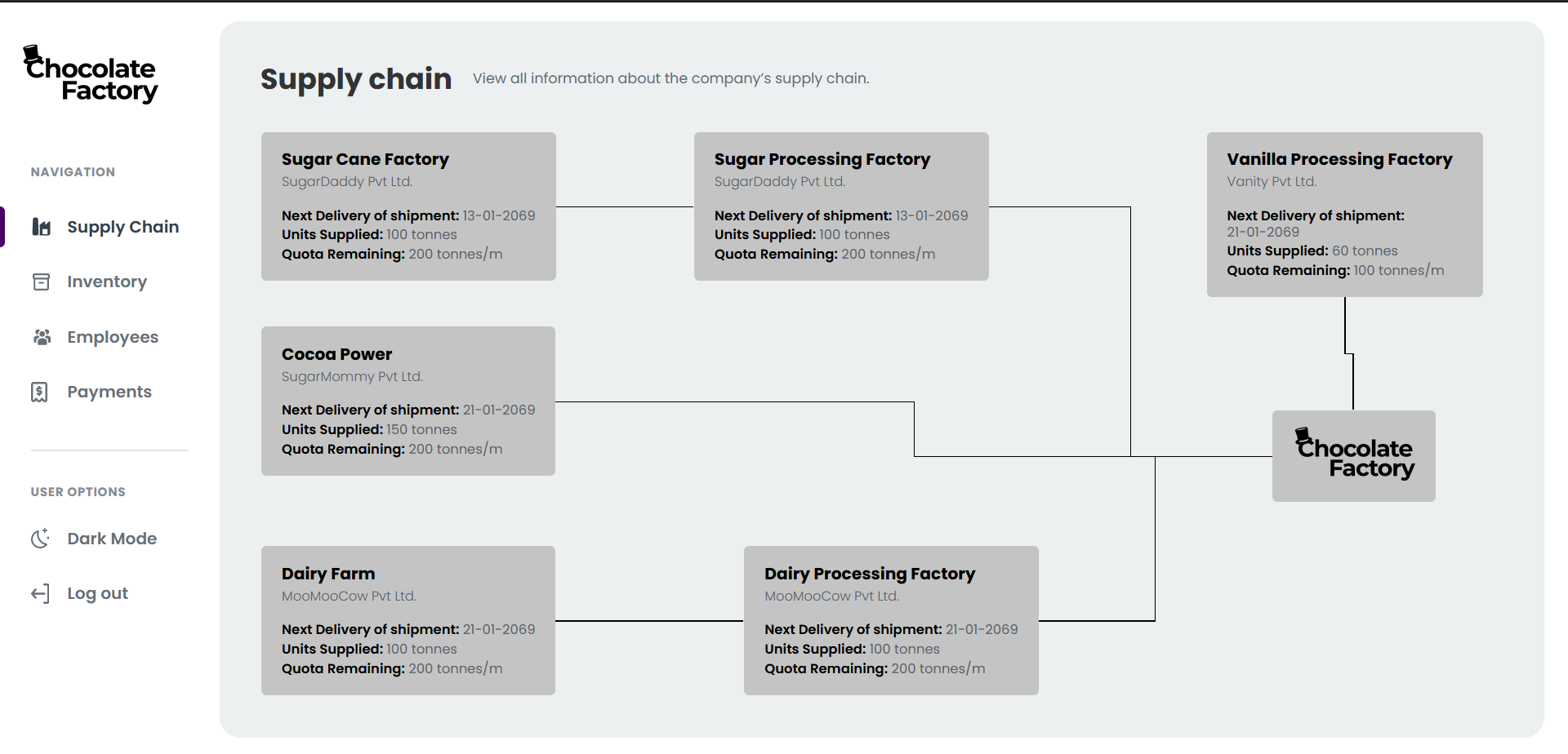 Divided into four parts, the web app is centred around the Supply Chain, a visual representation of all incoming material, complete with details of its distributors. It also includes the inventory and employees page, which allow the Oompa Loompas/11year old/management to view information about the reserved stock of resources/material, and employee attendance and salaries. Finally, it also includes a payments page, which lets you view all pending payments to distributors, marketplaces etc and can redirect you to the payment gateway.