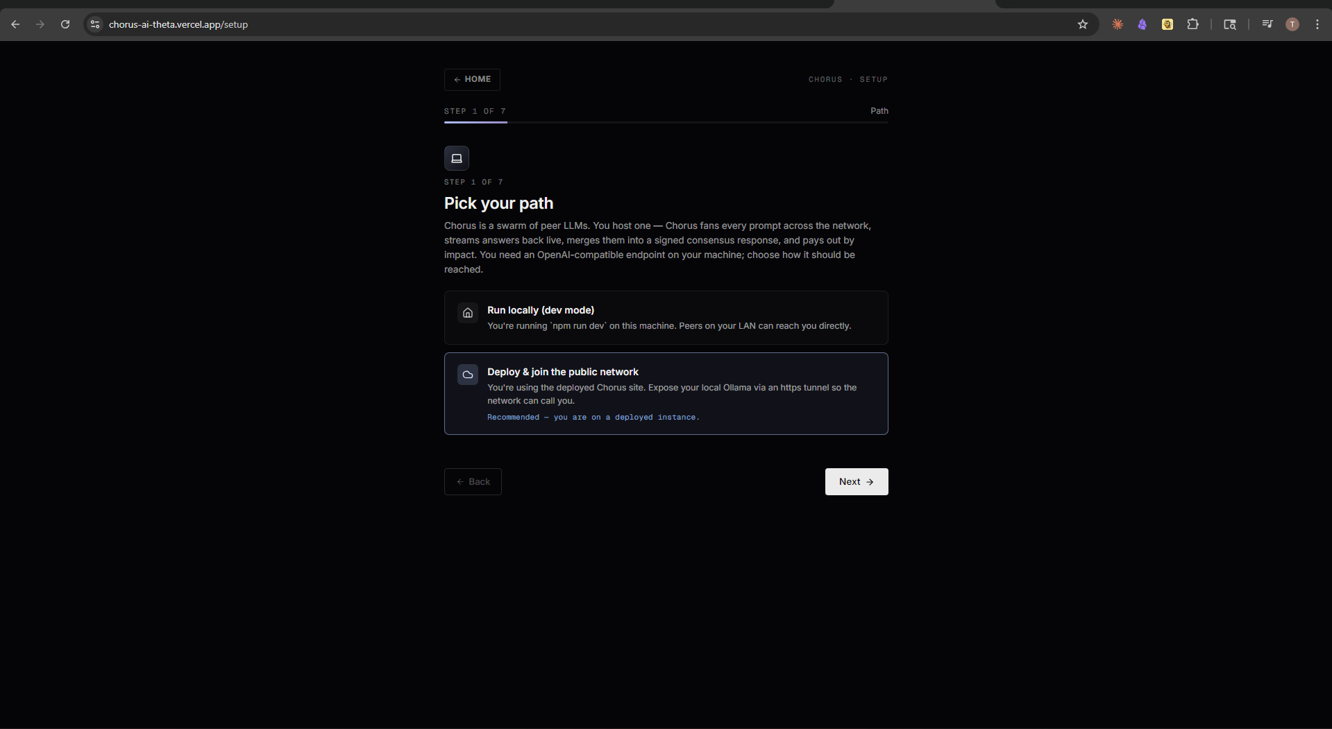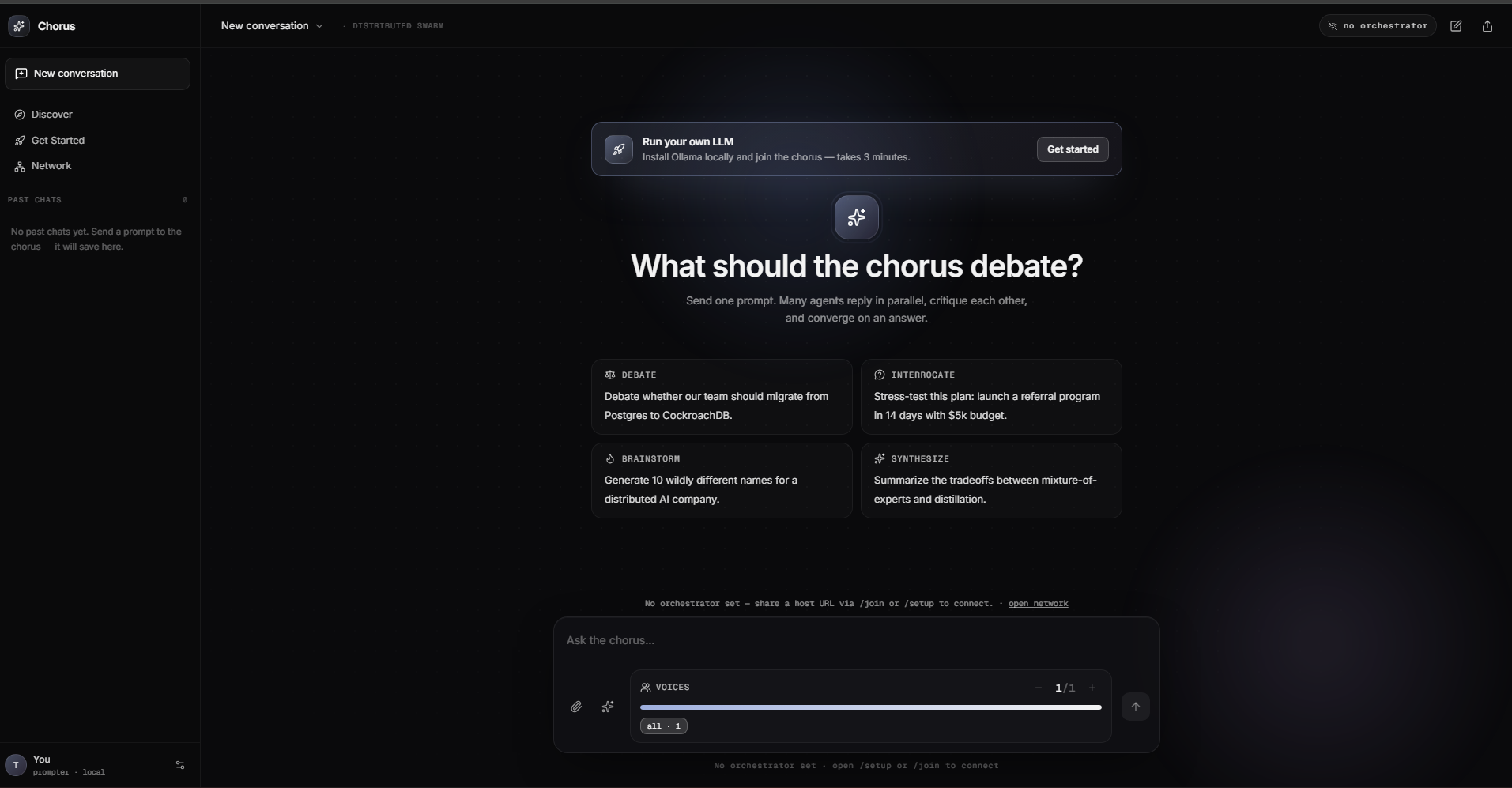 Why does every AI query funnel through one company's servers? One endpoint means one point of failure, one perspective, one entity capturing all the value. Meanwhile, millions of GPUs sit idle running local models overnight. We started with a wild idea: what if LLMs could debate each other? Ensemble methods dominate classical ML. Mixture-of-experts powers modern AI. Yet we still ask one model, one time, and hope for the best. Chorus is a marketplace for distributed AI inference where disagreement is a feature, every contributor gets paid fairly, and no single company controls the answer.