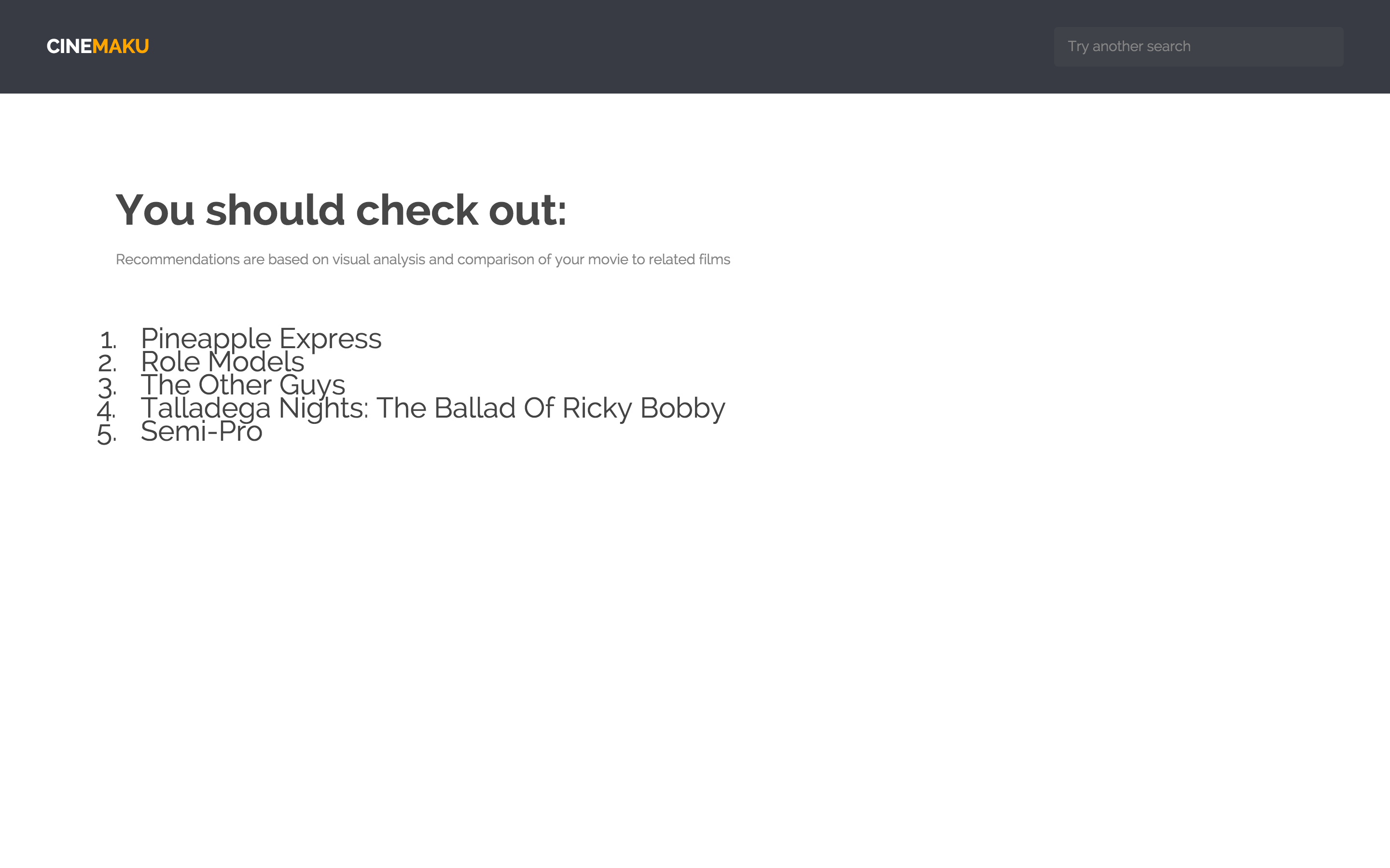 Cinemaku is an application that takes a novel approach to movie recommendations. Users enter a the title of a movie they enjoyed and Cinemaku begins working, by crawling the web to find stills of the movie. Using the Clarifai API, these movie stills are analyzed and digested to yield a set of "tags", which describe the visual content of the movie based on some of its most important scenes. By doing so, Cinemaku is able to identify certain visual aspects of movies that appeal to viewers which maybe unknown to them. After tags are identified, Cinemaku again takes to the web, this time leveraging the capabilities of Google Search API to find titles with similar visual characteristics as determined using the Clarifai API. After detailed visual analysis of numerous movies, users are presented with an ordered list of recommendations!