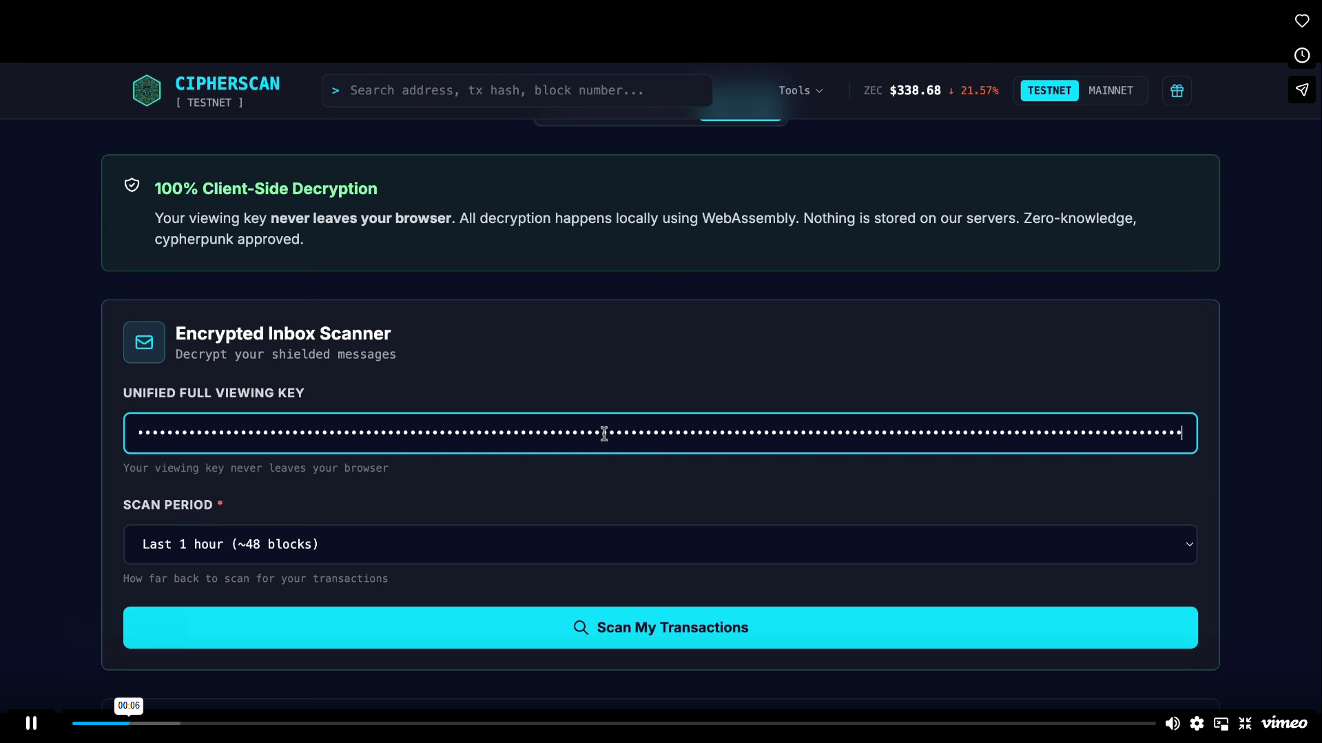 One of CipherScan’s most unique features is client-side Orchard memo decryption, allowing users to decrypt shielded memos directly in the browser without trusting any external server.