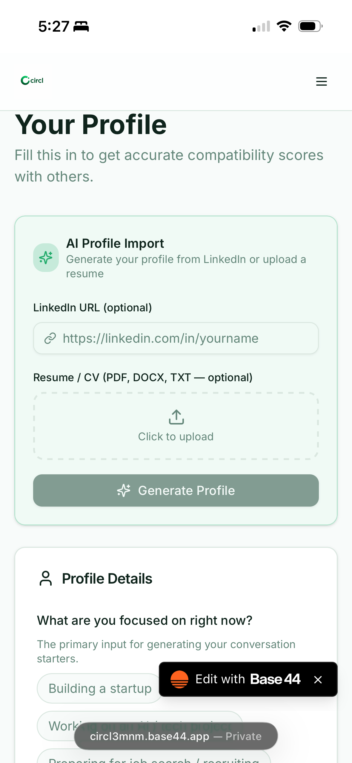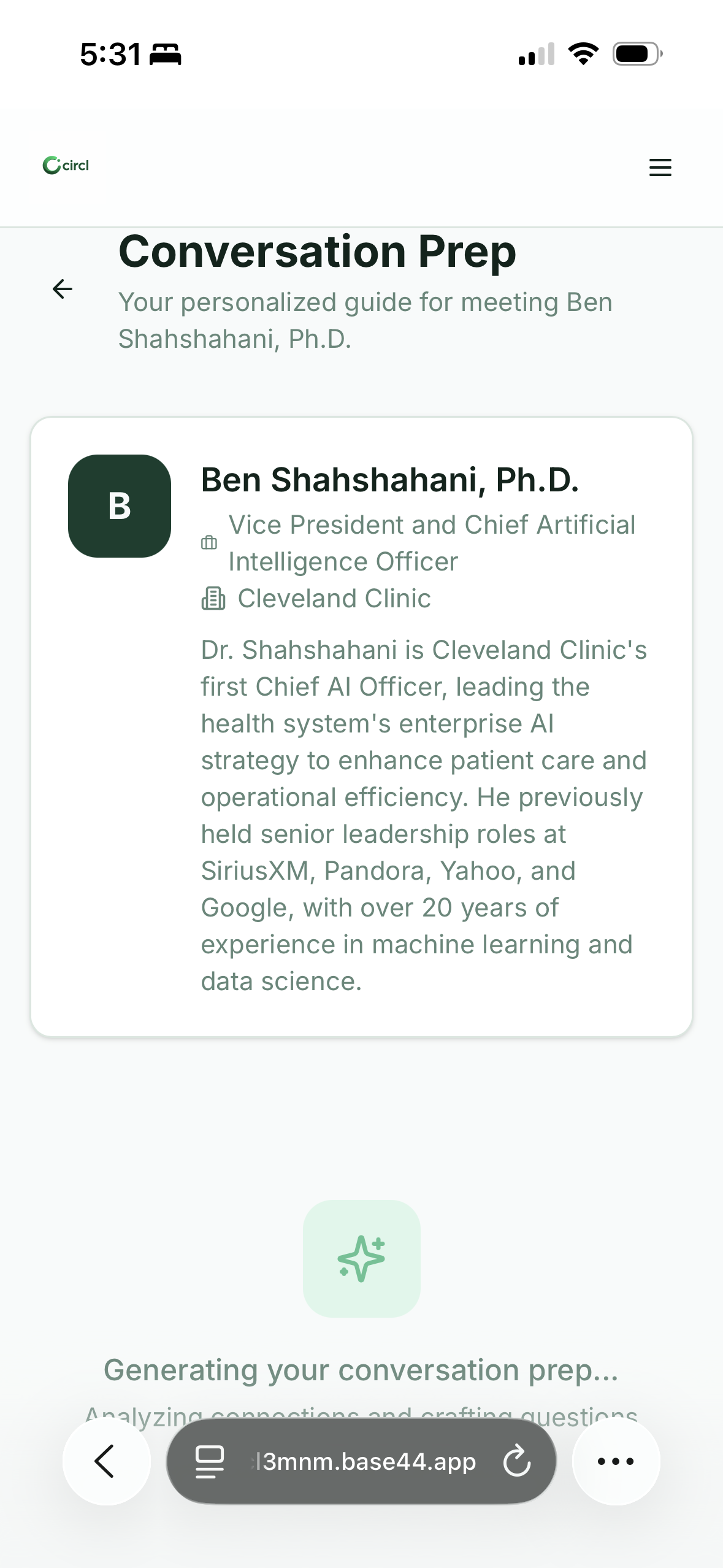Inspiration As students at San Jose State University in the heart of Silicon Valley, we attend many networking events. However, we noticed a clear disconnect; while everyone wants to connect, conversations often feel awkward and superficial. Research shows that 80% of professionals value networking, yet many struggle with preparation and knowing what to say. We were inspired to build Circl to bridge this gap and turn networking into real opportunities, starting with our own community.