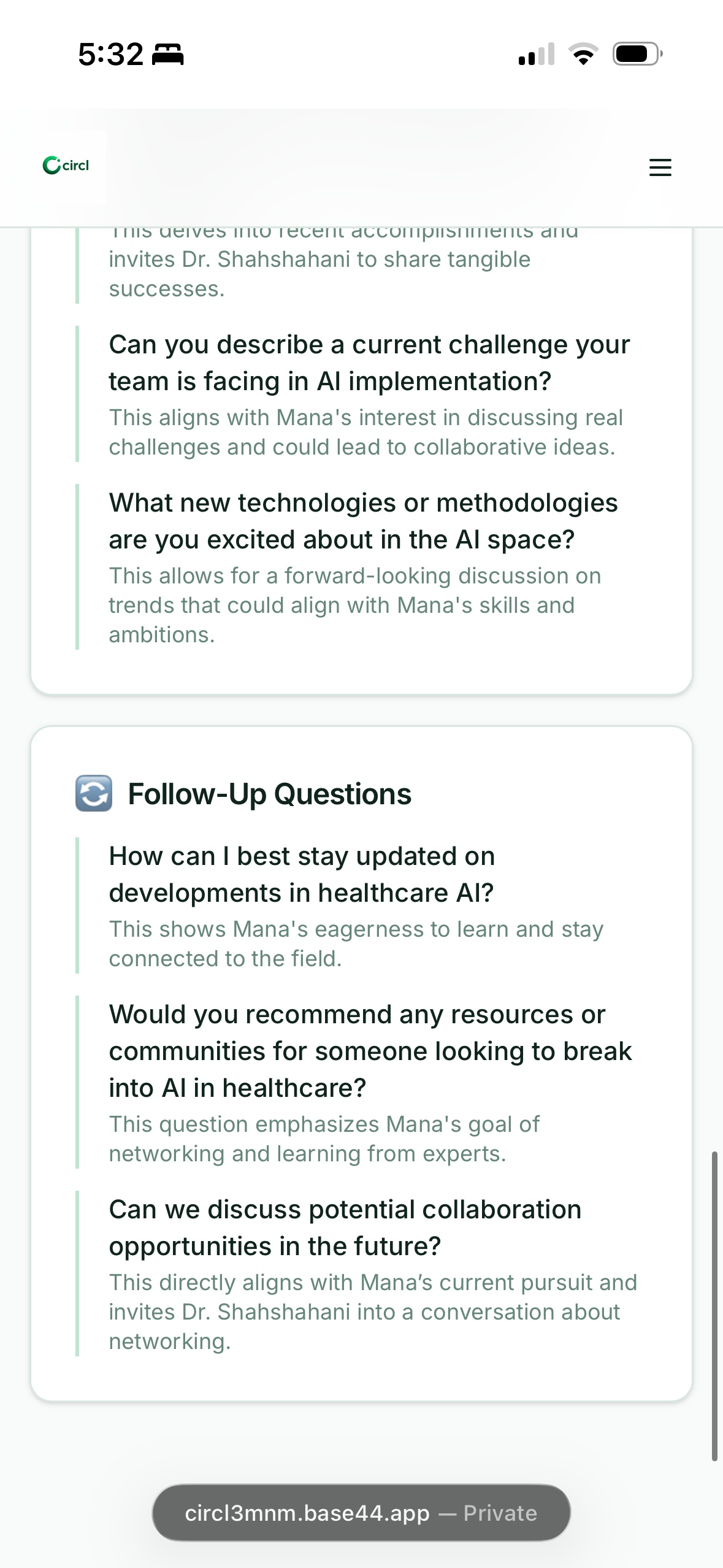 We are most proud of building a real solution to a problem we personally experienced. As non-STEM students, creating a fully functional AI application from scratch was a major achievement. Seeing Circl generate the exact kind of insightful questions we wished we had during our own past networking experiences was a powerful “aha!” moment. We didn’t just build an app; we created a tool that helps students network with confidence.
