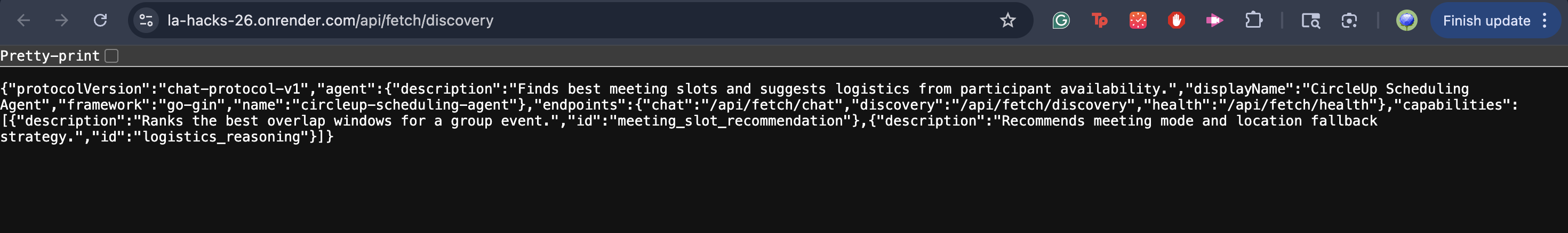 We shipped a full end-to-end flow: screenshot to event to AI recommendation to location-aware meetup suggestions, with live public deployment. We also made the agent discoverable and interoperable through Fetch.ai-compatible discovery/health/chat endpoints.