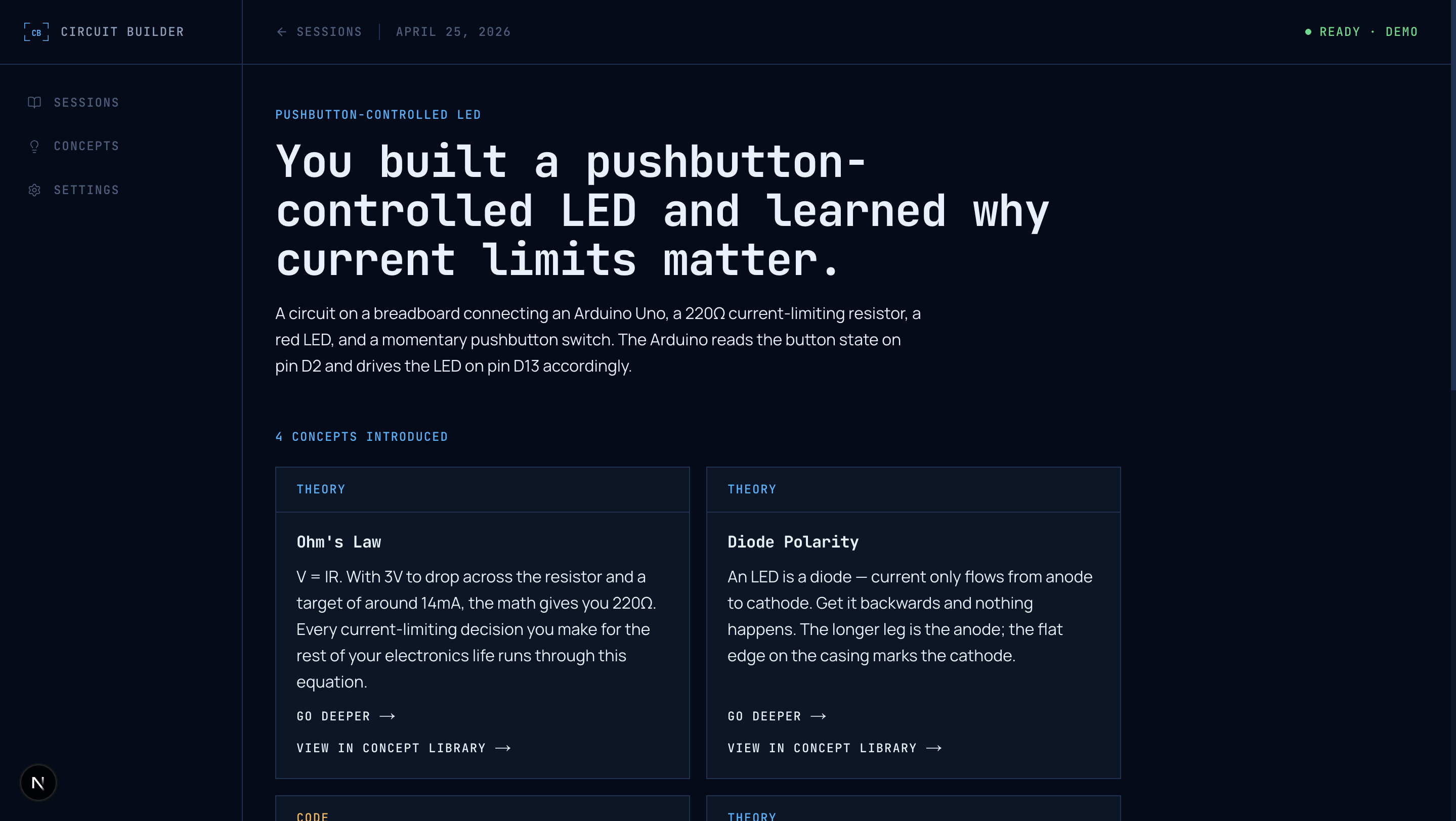 Building circuits is intimidating. Beginners stare at a breadboard — a grid of tiny holes where wires and components connect to form circuits — and have no idea where to start. Misplaced wires, confusing diagrams, and the constant back-and-forth between a screen and a physical board makes learning frustrating.