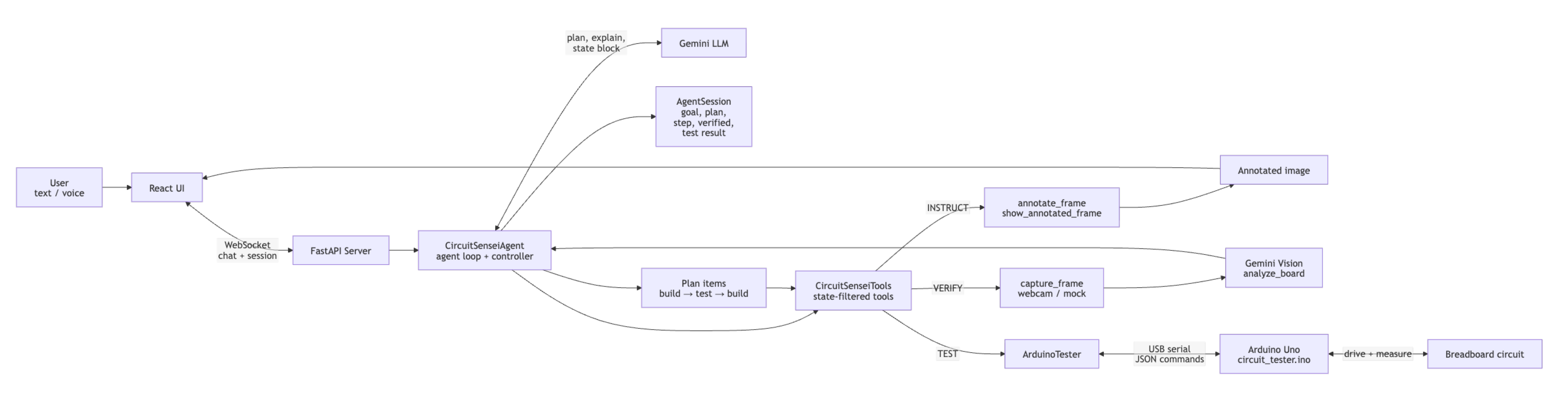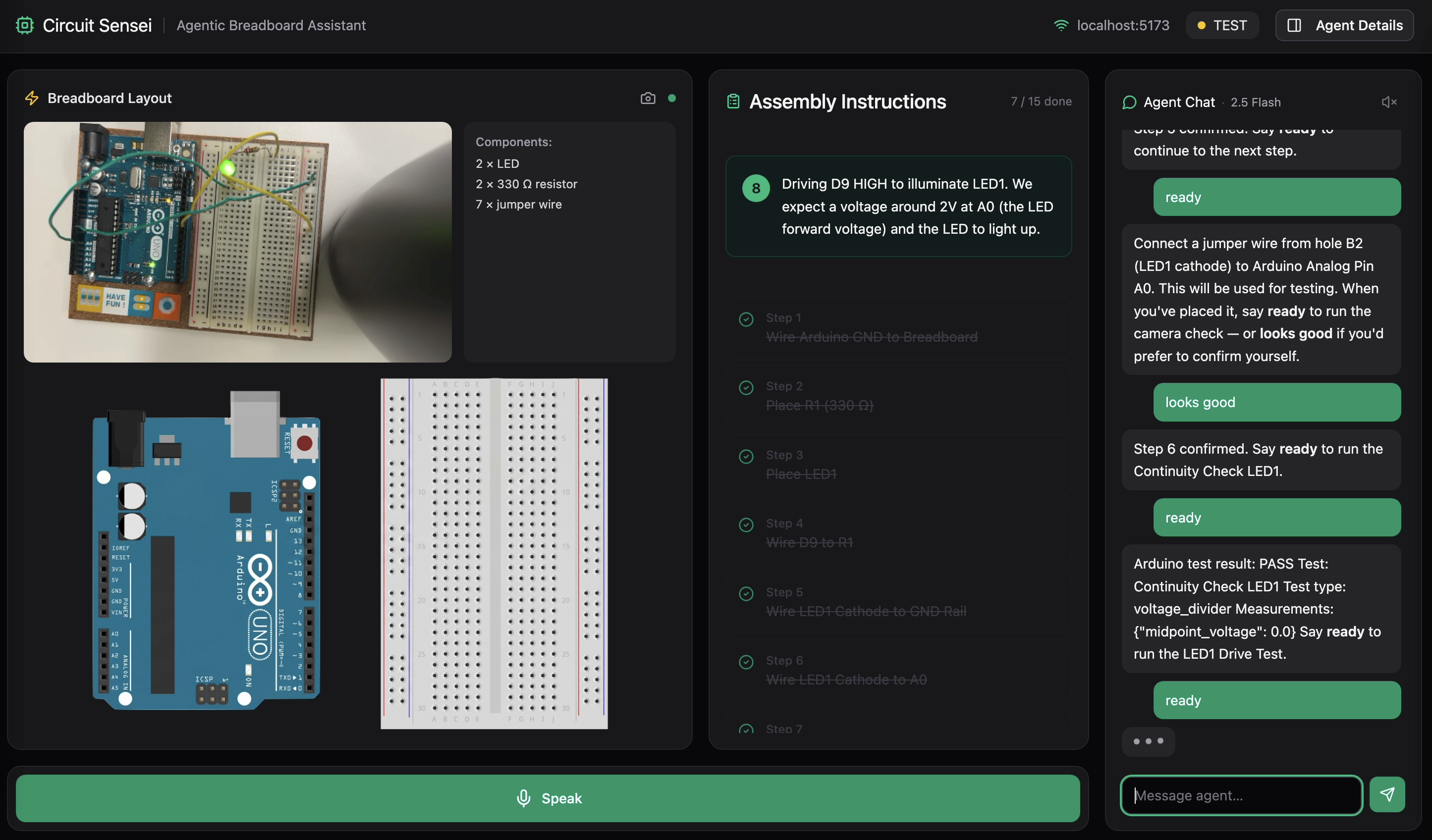 Backend: Python + FastAPI, with a WebSocket that streams agent state and chat messages to the browser in real time. The agent follows a state machine that manages the build workflow, but it's not rigid. If something goes wrong mid-build, the user can call it out ("the LED is dim," "I see 0V," "nothing happened") and the agent will pause the current step, connect to the Arduino, run the appropriate electrical measurement, interpret the results, and then resume exactly where you left off without losing any progress. The plan also interleaves build and test steps throughout, so the circuit is being electrically validated as it's assembled, not just checked at the end. It's less of a tutorial and more of a lab partner that can actually power your board and help you figure out what went wrong.
