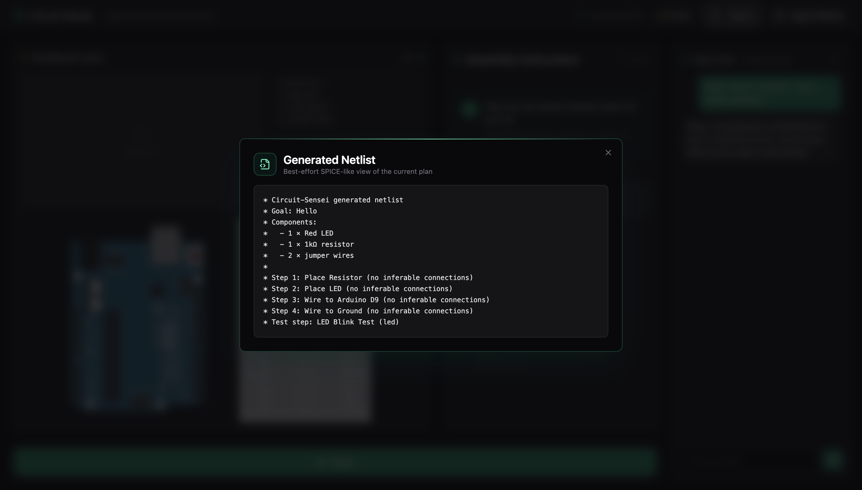 Connecting Circuit Sensei to a larger full-stack ecosystem capable of transforming ideas to real, physical, devices. Circuit Sensei is the first step in lowering the barrier to build and allow students and hobbyists to start prototyping rather than get bogged down in tutorials and messy diagrams. Currently the agent can provide a .netlist file, a text-based description of every component and connection in the circuit, which the user can import directly into schematic and simulation tools. Netlists are the standard format used across industry and research for describing circuits, so learning to work with them early bridges the gap between classroom breadboarding and professional design workflows. Continuing this pipeline allows more intermediate and advanced users to start simulating their circuits without needing full test benches and eventually to designing custom PCBs for their projects. Circuit Sensei will keep the ethos of being a mentor at each stage, being a check and verify system rather than hand-holding and doing it all on its own rather than having the user get their hands dirty.