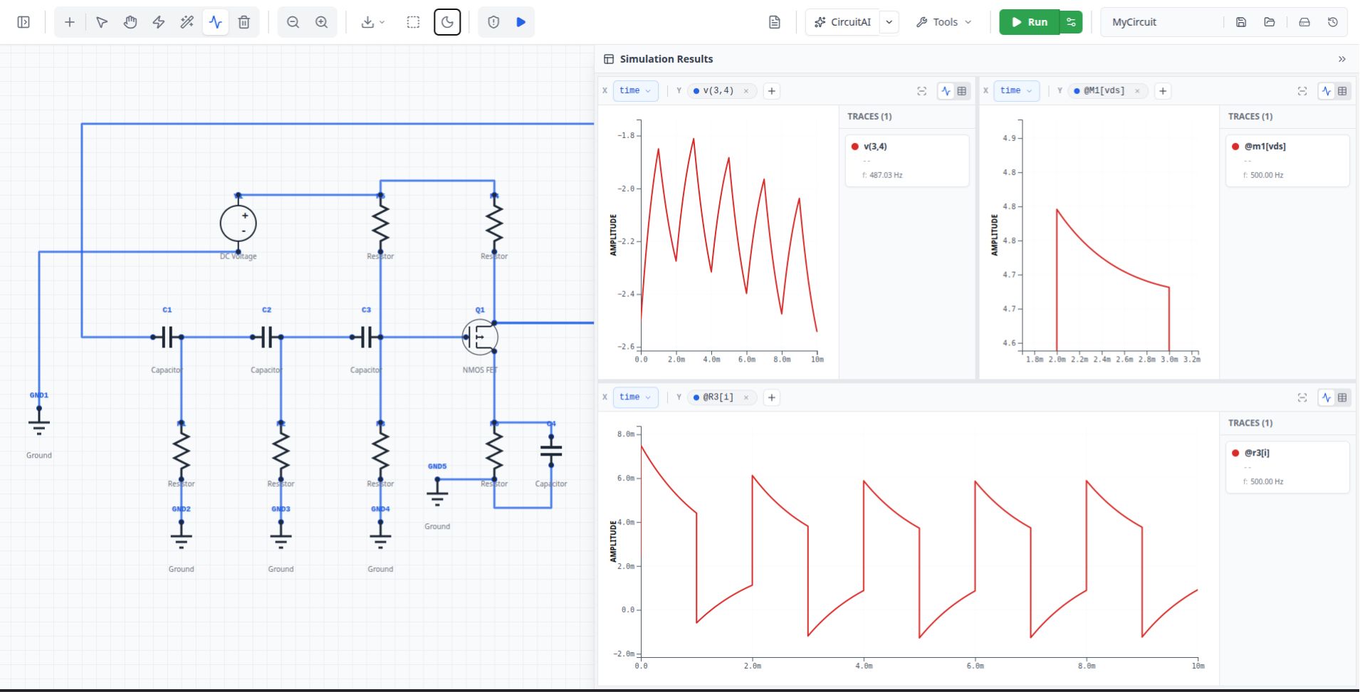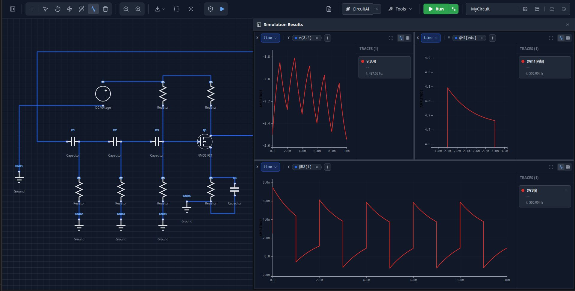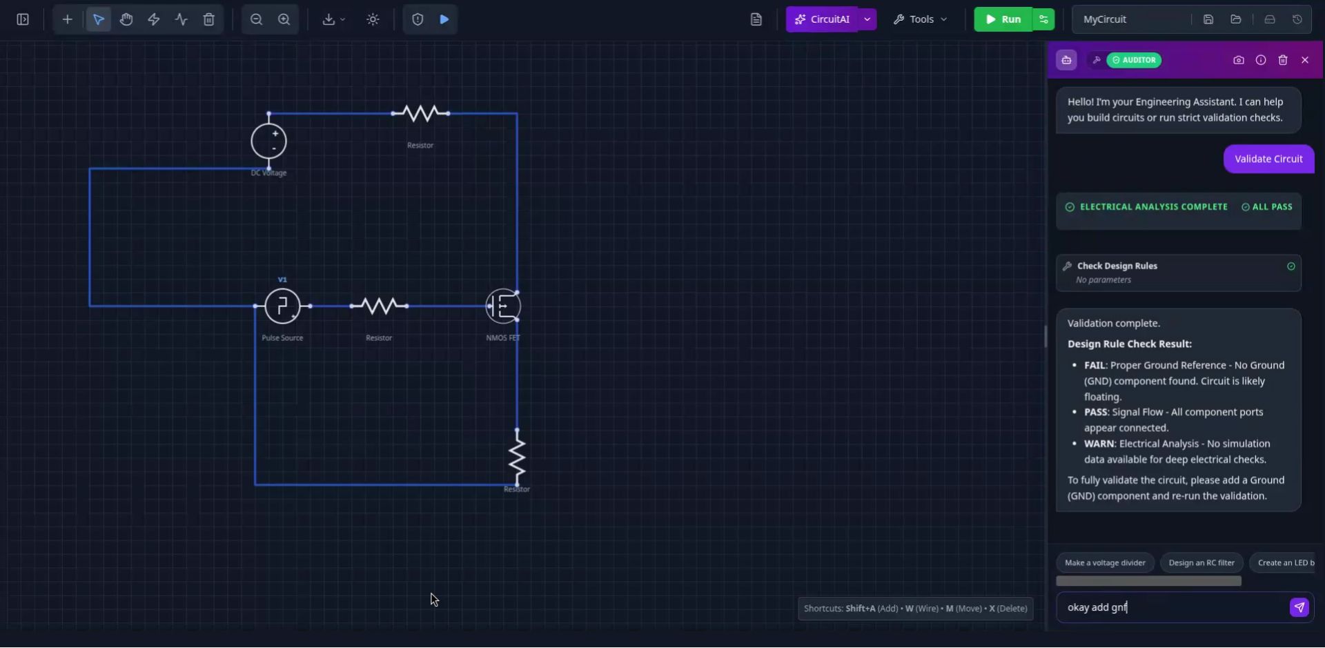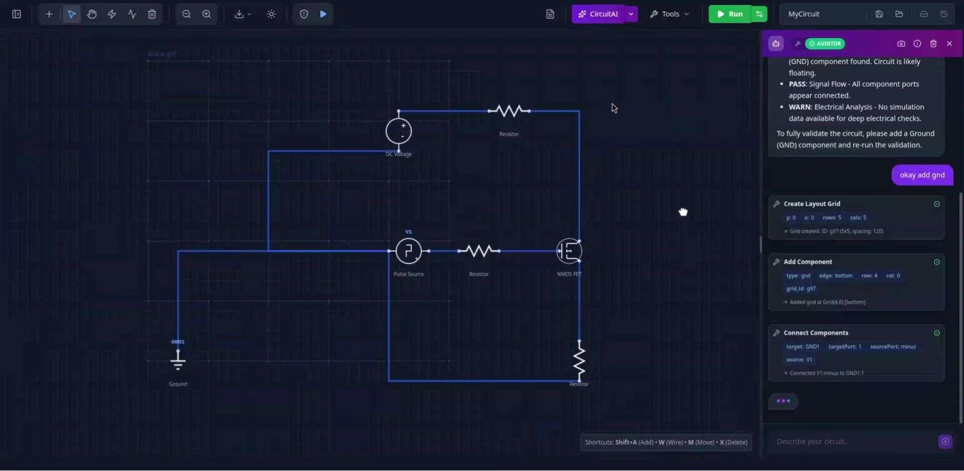 CircuitFlow: Project Story Team CircuitFlow February 1, 2026 Project Story Inspiration Hardware engineering is inherently unforgiving. Unlike software, there is no simple undo button—only costly mistakes and, at times, literal “magic smoke.” Traditional electronics workflows involve slow and rigid iteration cycles: design, assemble, test, and repeat. We were inspired by the rapid feedback loops present in software development and sought to bring that experience to electronics. Our goal was to create a platform where engineers could experiment freely, validate designs instantly, and gain confidence before building physical hardware. This motivation led to the creation of CircuitFlow, a browser-based, AI-assisted circuit simulator designed to make hardware design feel as safe and iterative as writing software. What it does CircuitFlow is a modern, web-based electronic circuit simulator and schematic capture tool. It combines: • An infinite schematic canvas, • Orthogonal auto-wiring, • A SPICE simulation engine compiled to WebAssembly, • And an integrated AI Engineering Agent. The platform enables users to: • Construct circuits using visual placement or natural language instructions, • Automatically route clean Manhattan-style interconnections, • Run realistic electrical simulations directly in the browser, • Analyze results using a virtual oscilloscope and data tables, • Validate and debug designs with AI-based reasoning. This transforms the workflow from: “Hope it works” → “I know it works.” 1 How we built it CircuitFlow is implemented as a full in-browser Electronic Design Automation (EDA) platform. Schematic Editor • Infinite Canvas: Supports unlimited panning and zooming for large-scale designs. • Orthogonal Auto-Wiring: Utilizes an A* pathfinding algorithm with Manhattan geometry to route wires around obstacles. • Smart Component Library: Includes passive components (R, L, C), sources (DC, Pulse, Current), and semiconductor devices (BJT, MOSFET, Diodes, Operational Am- plifiers). • Keyboard Shortcuts: Quick-add (Shift+A), Wire (W), Move (M), and Probe (P). SPICE Simulation • Browser-Based Engine: Runs ngspice directly in the browser using WebAssembly, requiring no backend server for simulation. • Analysis Modes: – Transient Analysis (.TRAN): Time-domain behavior. – DC Sweep (.DC): Parameter variation and response. – Operating Point (.OP): Static bias calculation. • Lab Workbench: Includes a virtual oscilloscope and data tables for waveform and numerical analysis. • Visual Probing: Interactive selection of nodes for voltage plots and components for current or power visualization. AI Co-Pilot (CircuitAI) • Powered by Google Gemini 3.0. • Translates natural language specifications into structured circuit topologies. • Performs Electrical Rule Checks (ERC) and Design Rule Checks (DRC). • Generates automated Markdown reports including pass/fail criteria, efficiency metrics, and datasheet references. • Employs multimodal vision by capturing canvas snapshots to detect layout and orien- tation issues. All computation is executed locally, ensuring low latency, privacy, and offline oper- ability. 2 Challenges we ran into • Porting a mature C-based SPICE simulator to WebAssembly while preserving numer- ical stability. • Designing a real-time auto-routing system capable of maintaining interactive frame rates. • Enforcing physical and electrical constraints on AI-generated circuit designs. • Balancing simulation accuracy with browser performance. • Integrating multimodal reasoning into circuit validation workflows. Accomplishments that we’re proud of • Successfully executing true SPICE physics inside a web browser. • Achieving real-time orthogonal wire routing. • Creating an AI assistant that understands electrical connectivity and topology. • Delivering an integrated design, simulation, and validation environment. • Publishing the platform as fully open-source. What we learned • Hardware workflows can benefit significantly from software-style iteration loops. • Browser-based engineering tools can reach near-desktop performance levels. • AI systems become reliable when constrained by domain-specific physical laws. • Usability is as important as numerical correctness in engineering tools. • Innovation emerges from the intersection of physics, artificial intelligence, and user experience. What’s next for CircuitFlow • Integration of AC and noise analysis modes. • AI-driven circuit optimization and fault injection. • PCB layout export and manufacturing pipeline support. • Real-time collaborative circuit editing. • Expansion of virtual laboratory instruments (logic analyzers and spectrum analyzers). CircuitFlow aims to become the VS Code of Hardware Engineering.