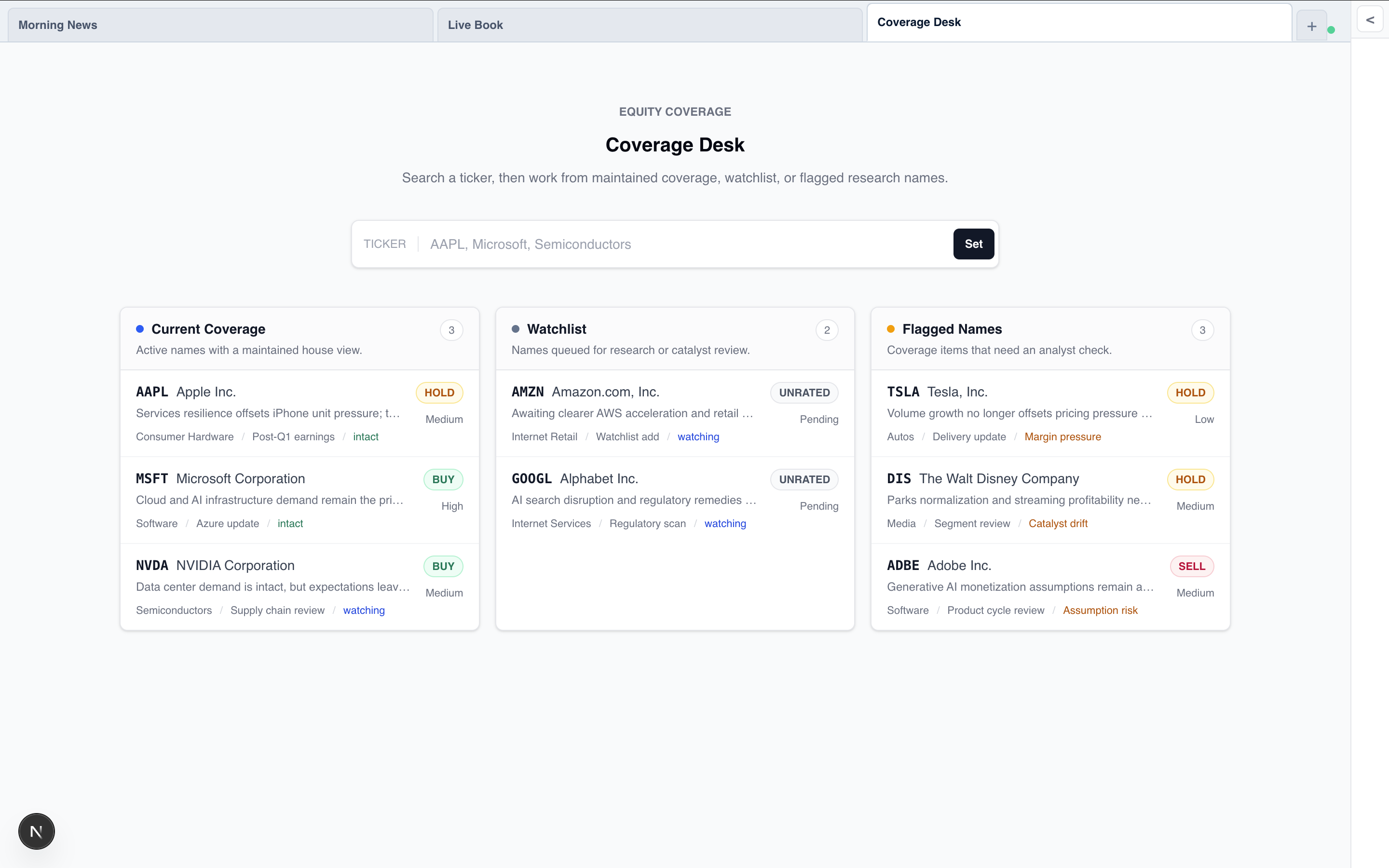 Investment teams do not need another generic chatbot. They need a desk that can read the market, form a view, pressure-test it, create real deliverables, and keep watching after the trade is on.