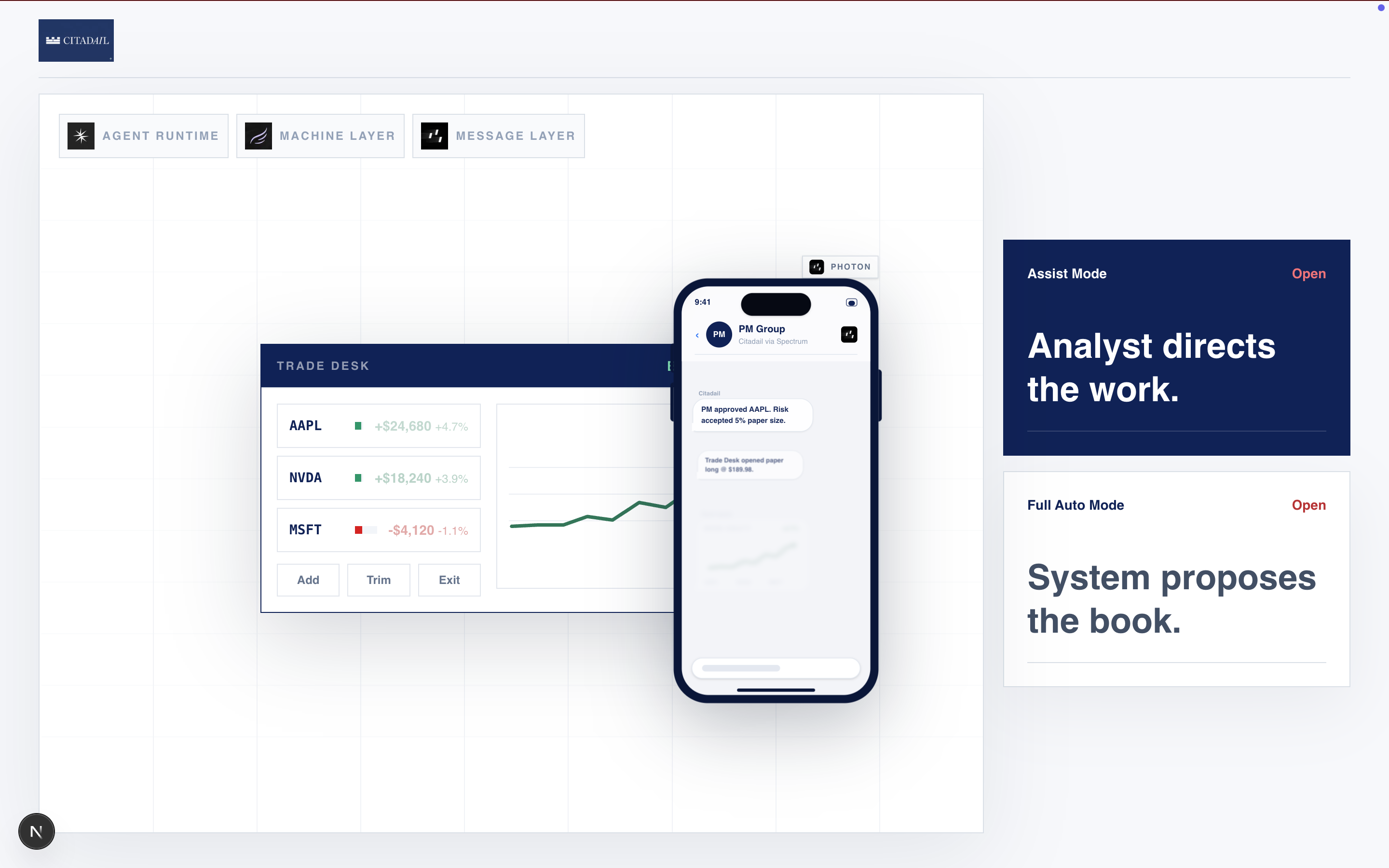 Photon Spectrum powers the iMessage integration, letting the desk send PM-friendly updates, book summaries, ticker news, runtime status, and artifact links into a group chat.