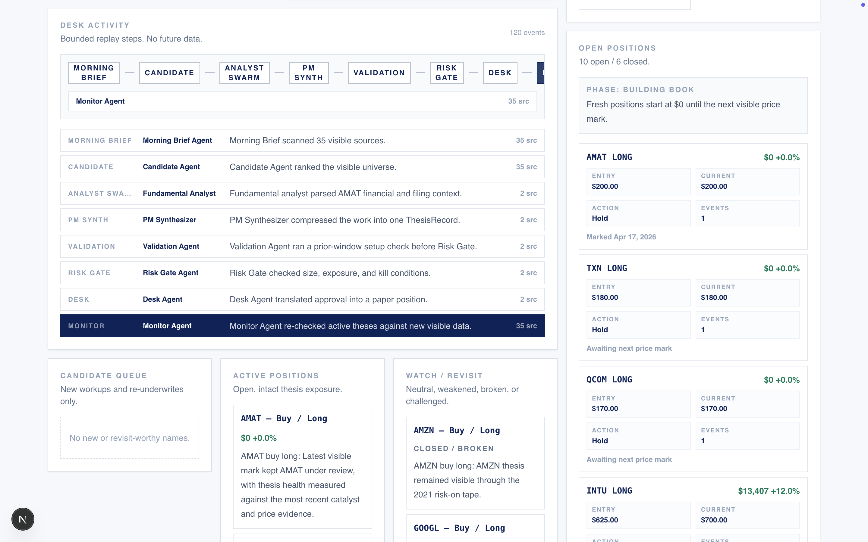 Full Auto Mode runs a walk-forward paper investment desk from a historical start date to the present. At each simulated point in time, the system only sees data known at that moment. It scans the market, selects candidates, generates theses, runs PM/risk review, opens paper positions, monitors them, and journals every decision.