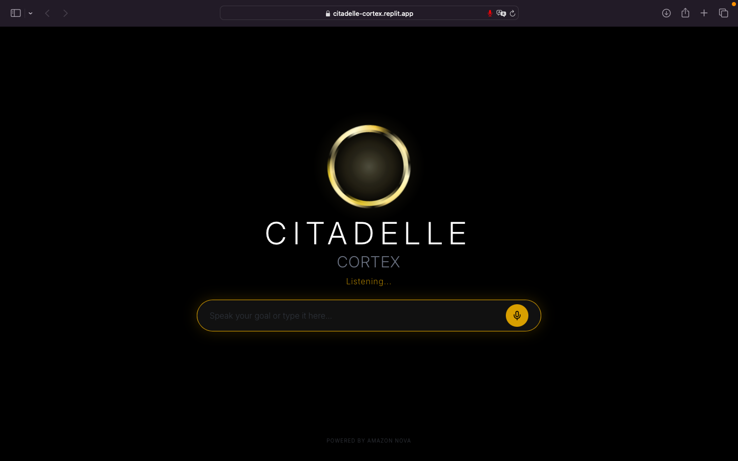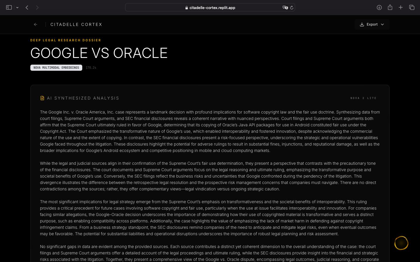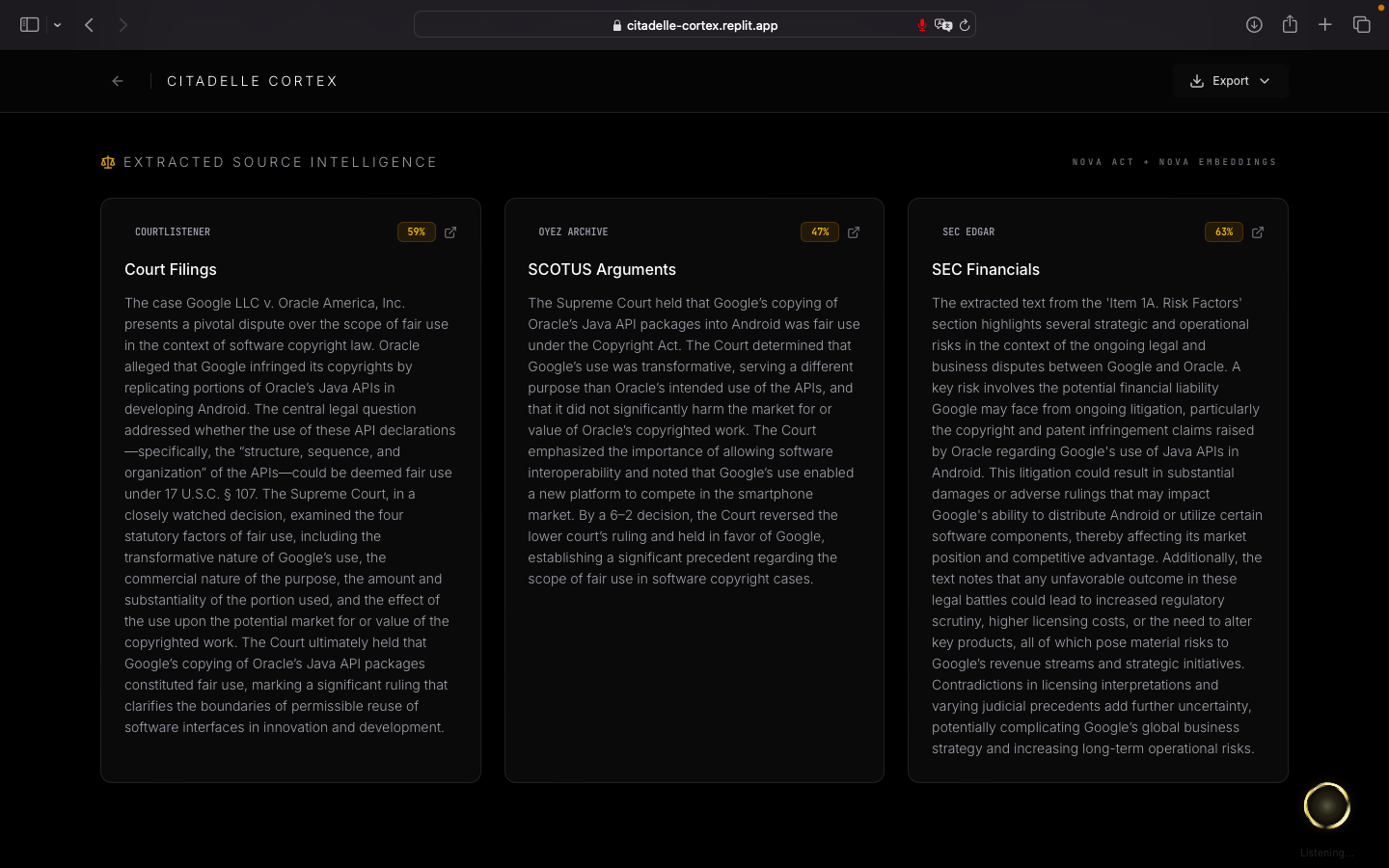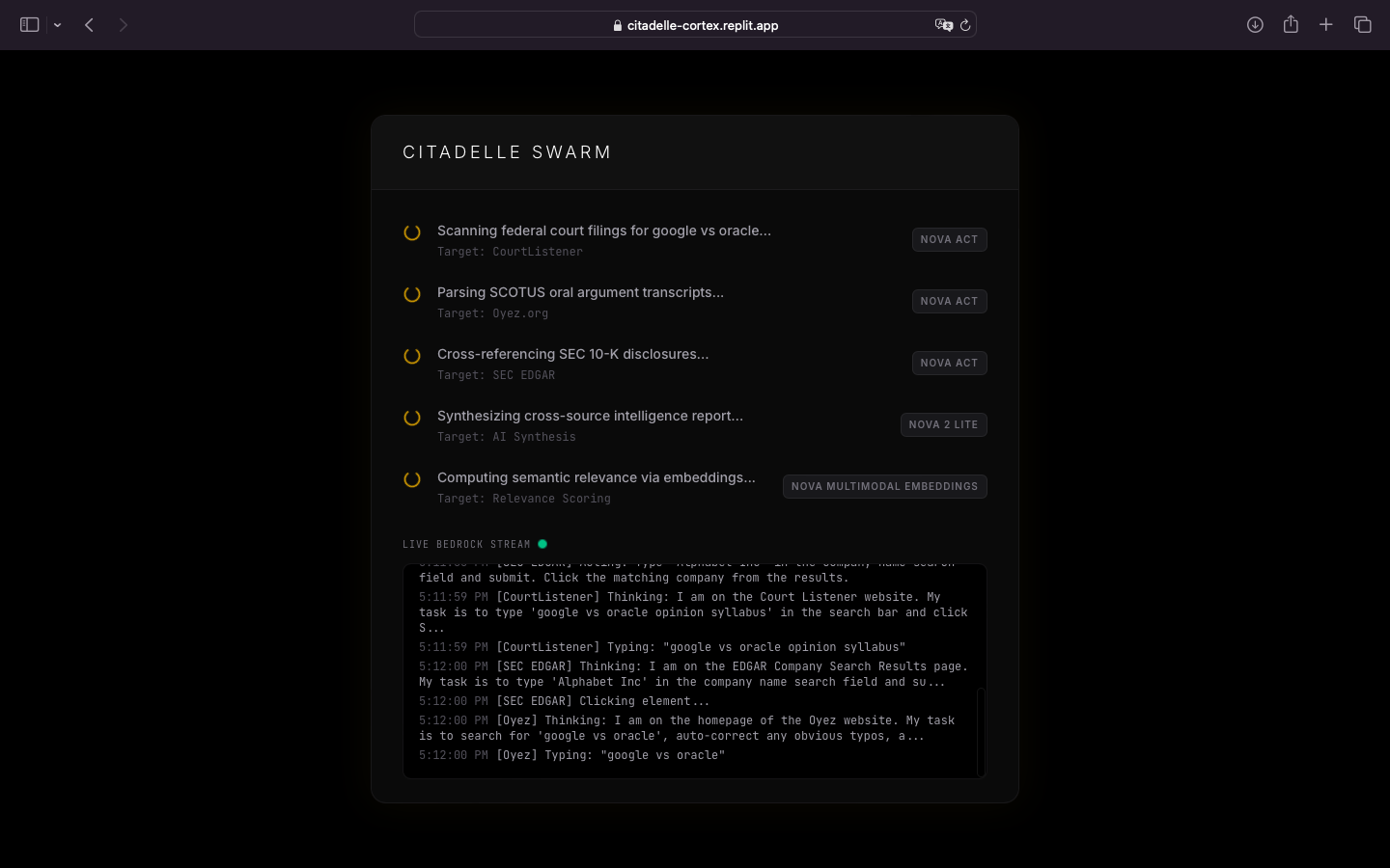 Citadelle Cortex deploys three simultaneous browser agents (using Nova Act) to independently navigate SEC EDGAR, Oyez, and CourtListener. It extracts the relevant documents, uses Amazon Nova Multimodal Embeddings to calculate a semantic relevance score across the different sources, and uses Nova 2 Lite to synthesize a "Master Dossier." Finally, users can interact with the dossier via a voice-activated orb powered by Nova 2 Sonic.
