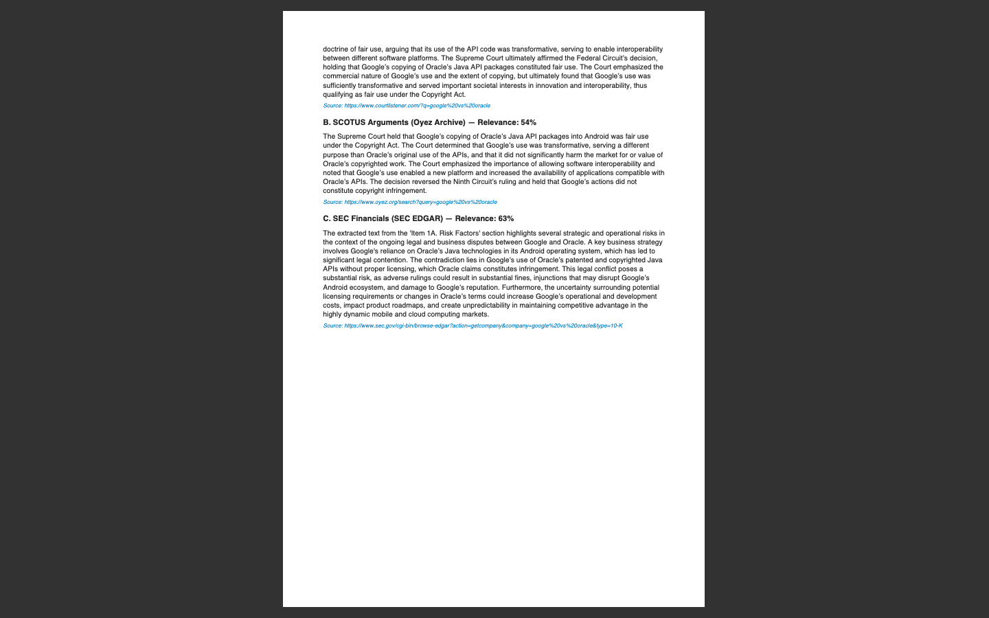 The final exportable Master Dossier (PDF/DOCX). Gives litigators a formatted, court-ready document with cited sources and AI synthesis.