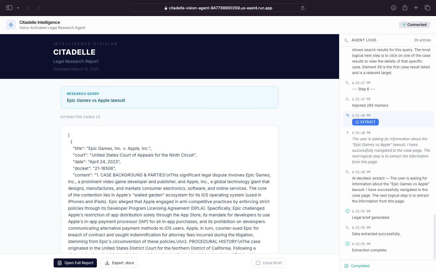 When a user gives a voice or text command (e.g., "Find the Epic Games vs. Apple lawsuit on CourtListener and summarize it"), Citadelle: