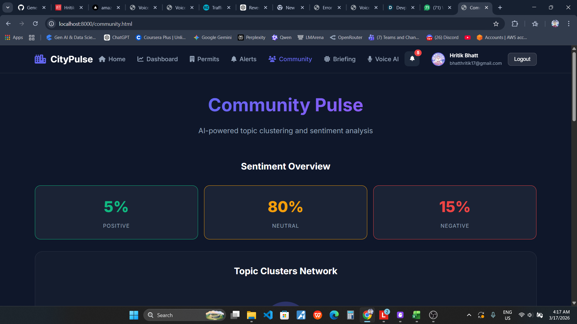 I was inspired to create CityPulse after seeing my neighbor miss a crucial public hearing about a high-rise development next door because the permit notice was buried in a government website. This made me realize: What if AI could monitor the entire city's digital footprint and proactively alert citizens about what matters to them?