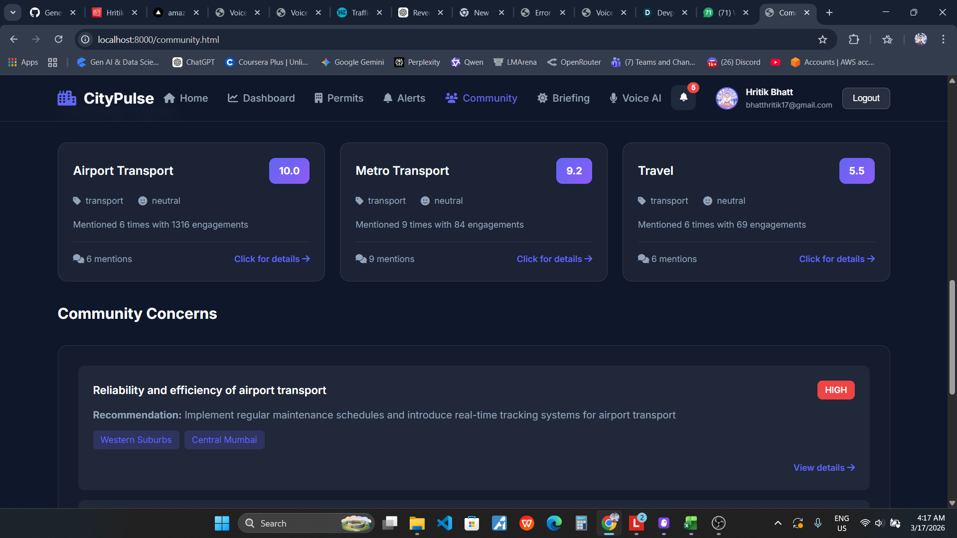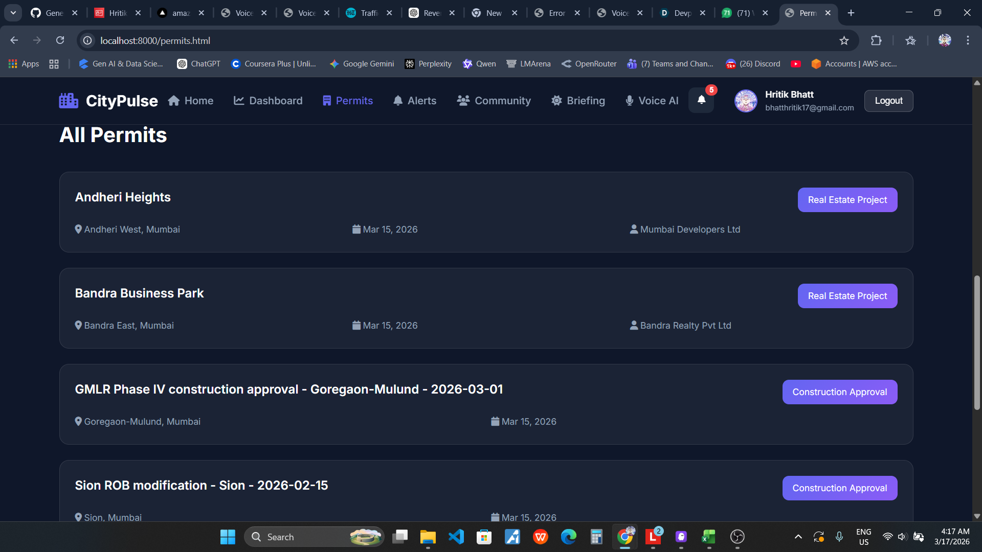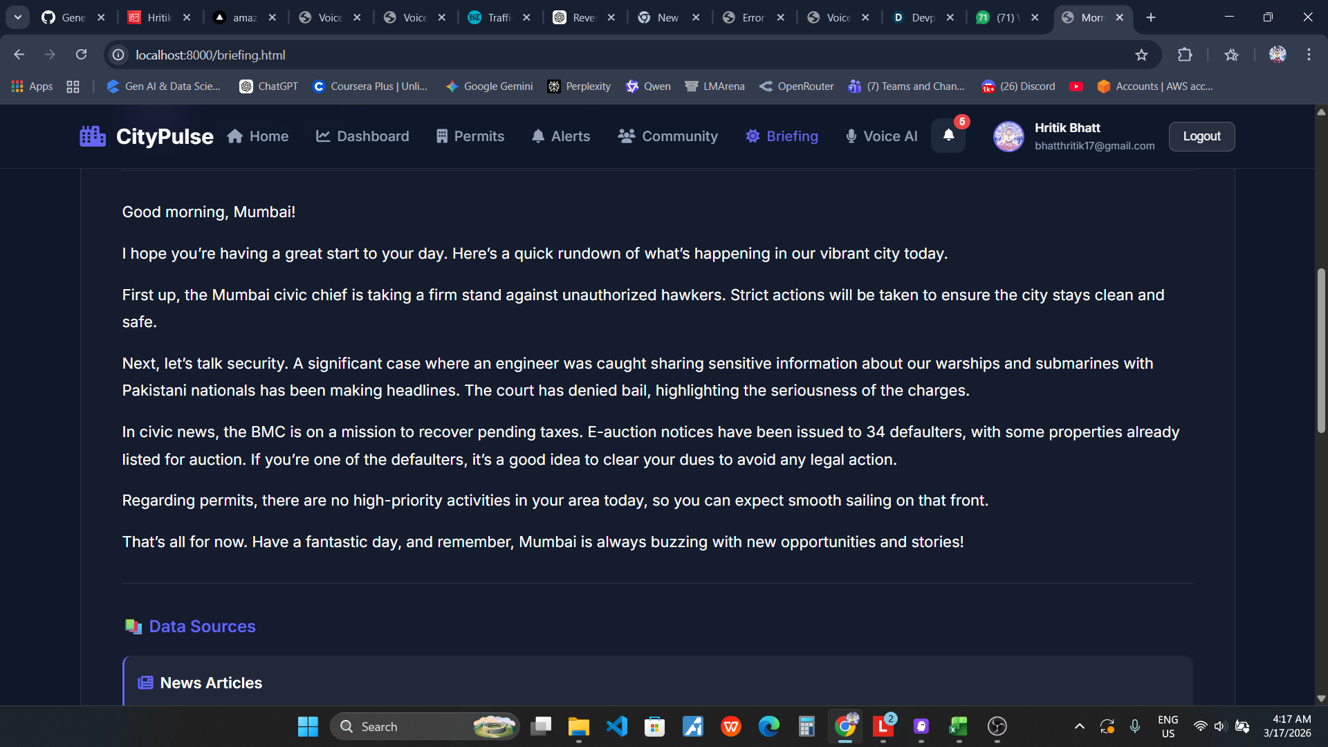 Living in Mumbai, I witnessed firsthand how citizens struggle to stay informed about their neighborhood. Important information about construction permits, safety alerts, and community issues is scattered across multiple government portals, social media, and news sources. Most people only discover critical changes in their area when it's too late - a new construction blocking their view, a road closure disrupting their commute, or a safety concern that could have been avoided.