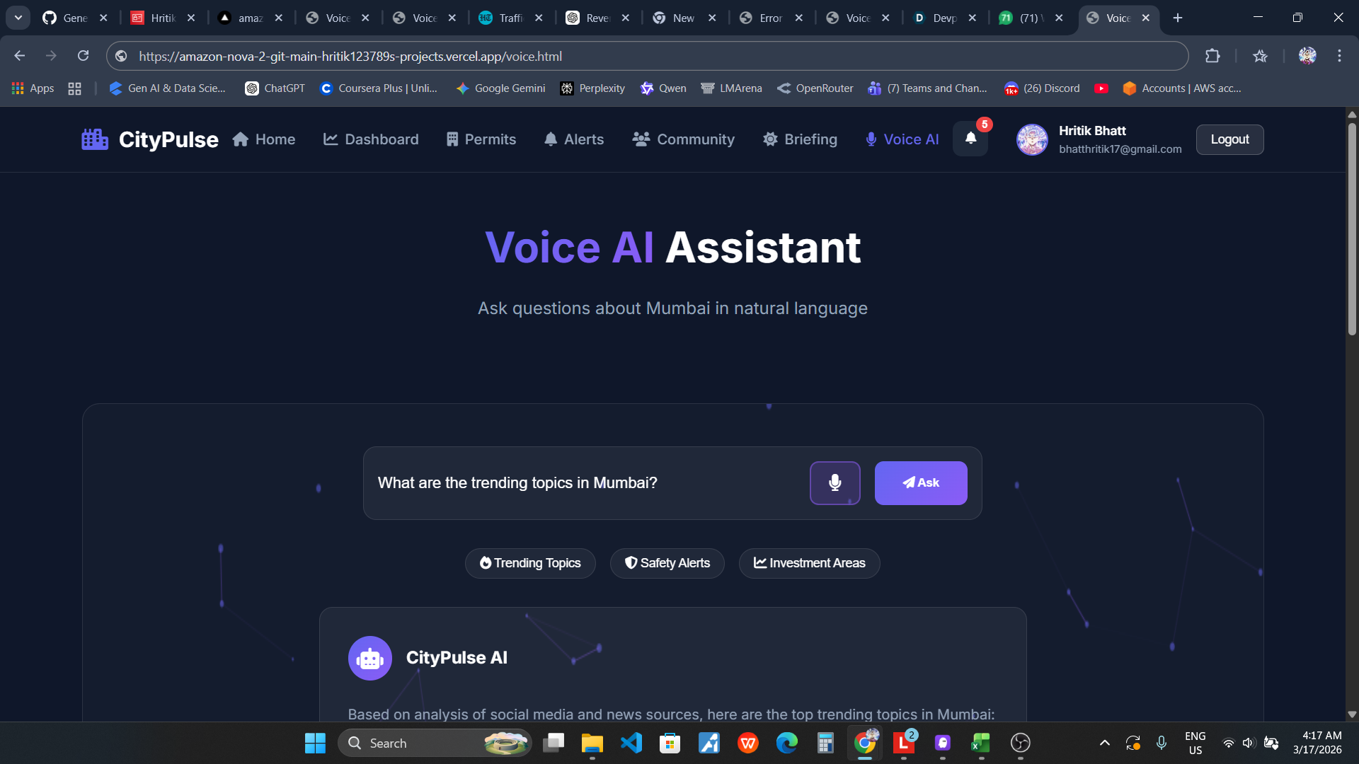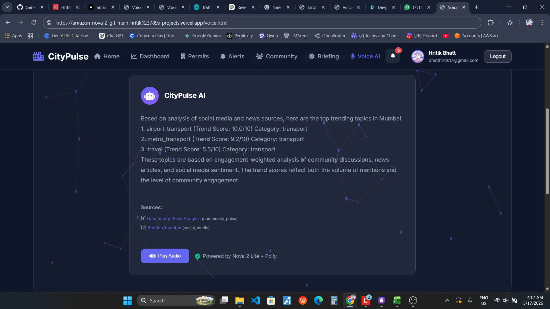 CityPulse is an AI-powered hyperlocal intelligence platform that monitors Mumbai's digital footprint 24/7 and provides actionable insights that actually affect your daily life. Unlike traditional chatbots or document processors, CityPulse is a proactive intelligence gathering system powered entirely by Amazon Nova AI models.