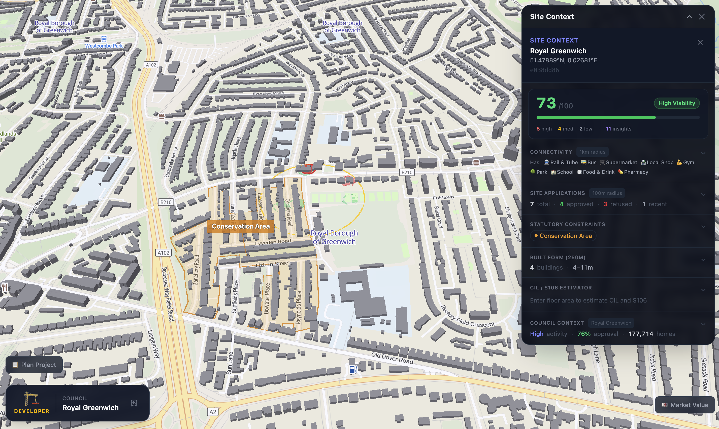 For Developers: Click any parcel to instantly generate a "Site Context." In seconds, the app assembles planning precedents, statutory constraints (Green Belt, Flood Zones), and market value heatmaps. An AI-powered "Build Mode" then runs a full development appraisal, estimating GDV, ROI, and approval likelihood.