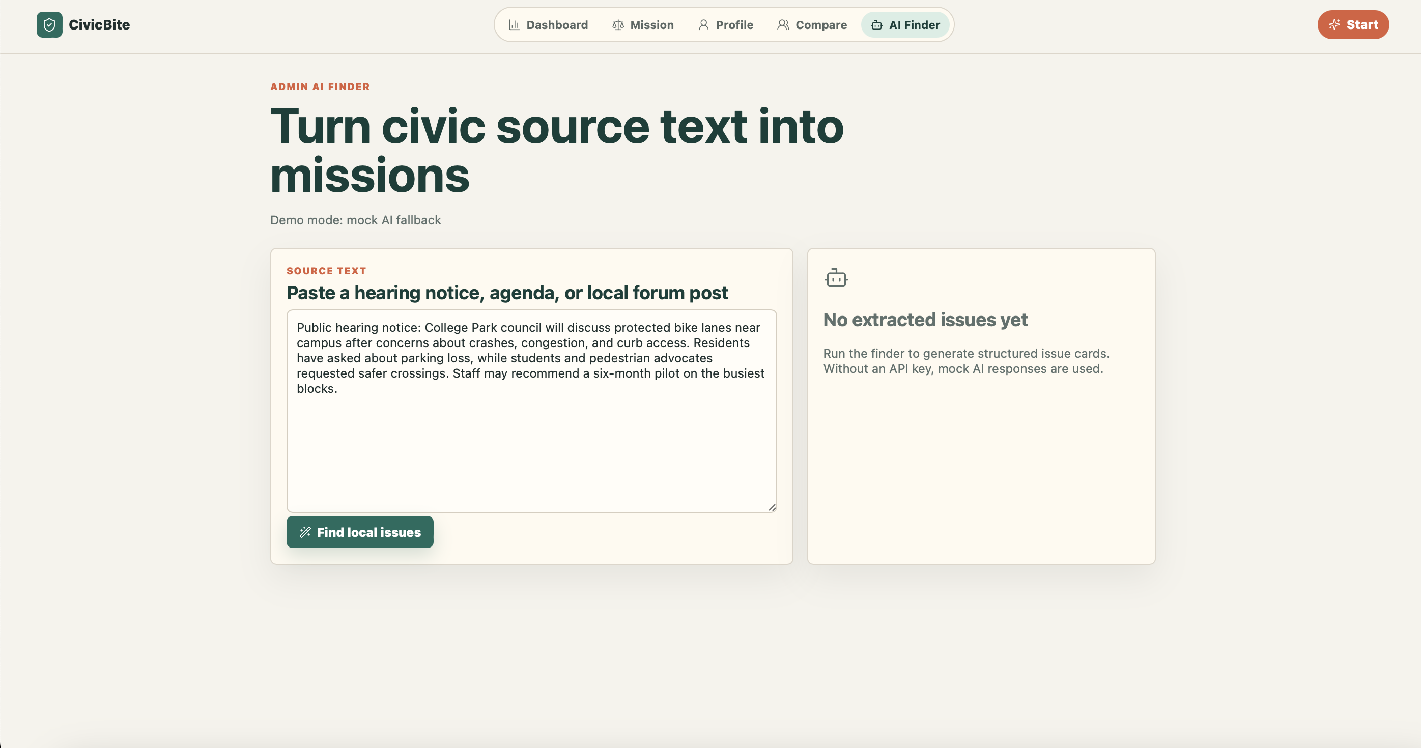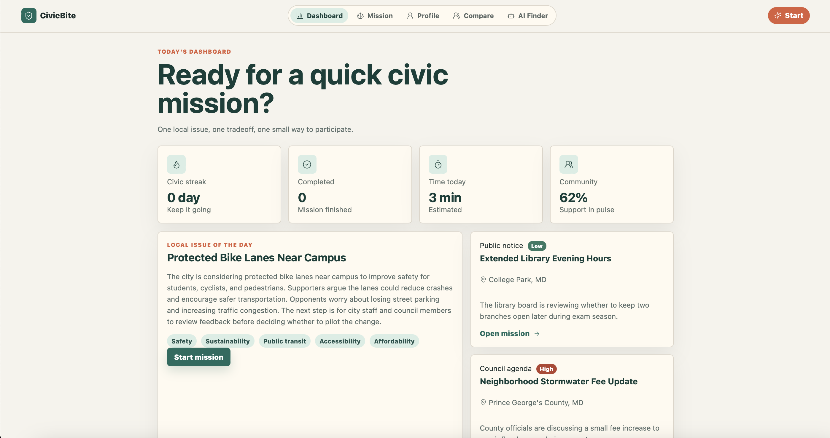 - Jurisdiction-specific mission packs. Partner with civic organizations, student governments, and city clerks to deploy CivicBite for specific cities and campuses, with hyperlocal issue feeds. UMD's College Park council would be a natural pilot.