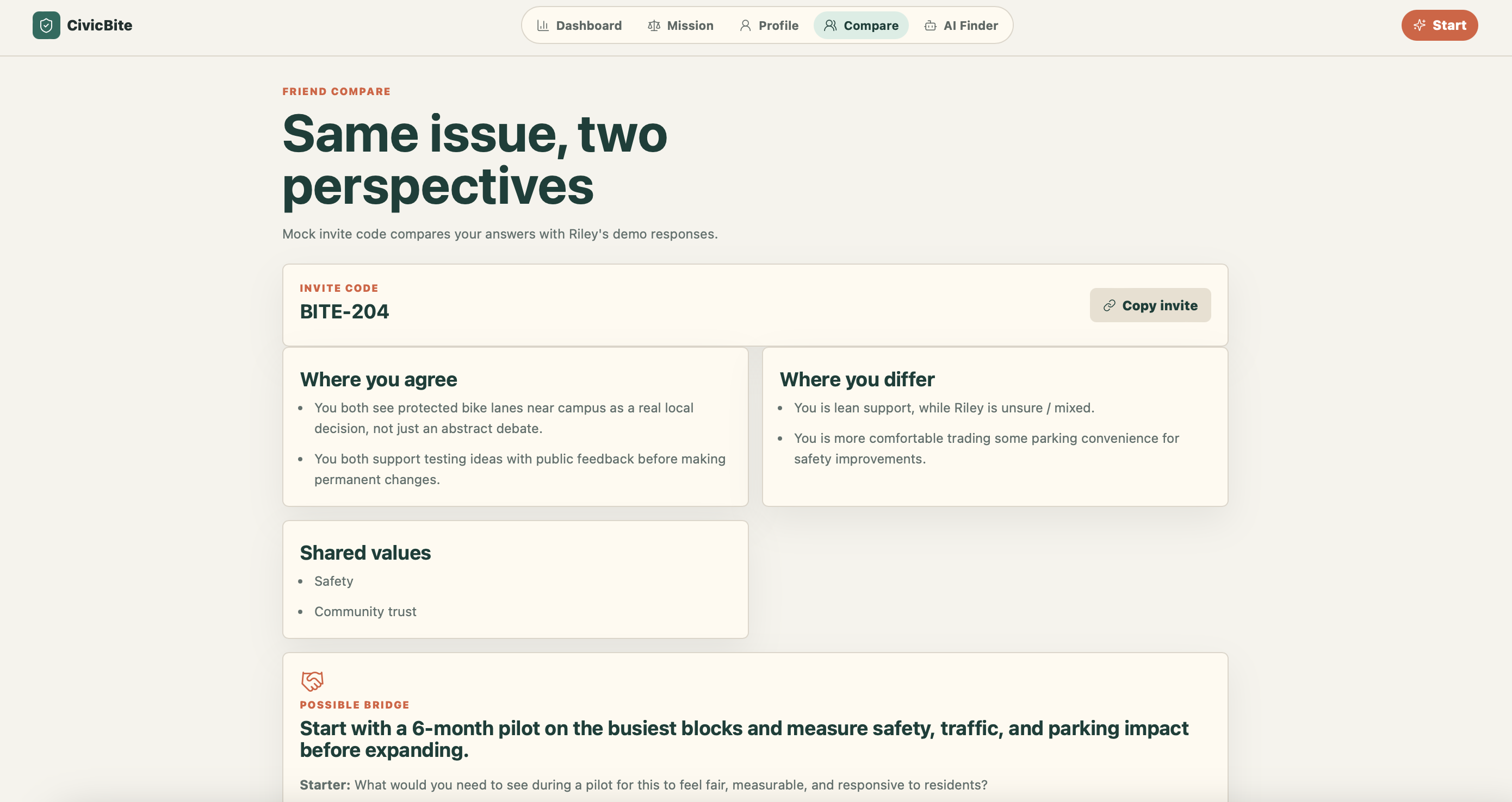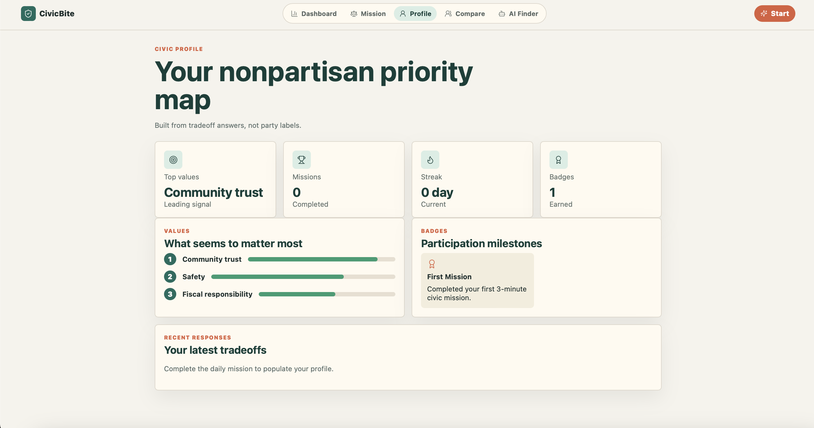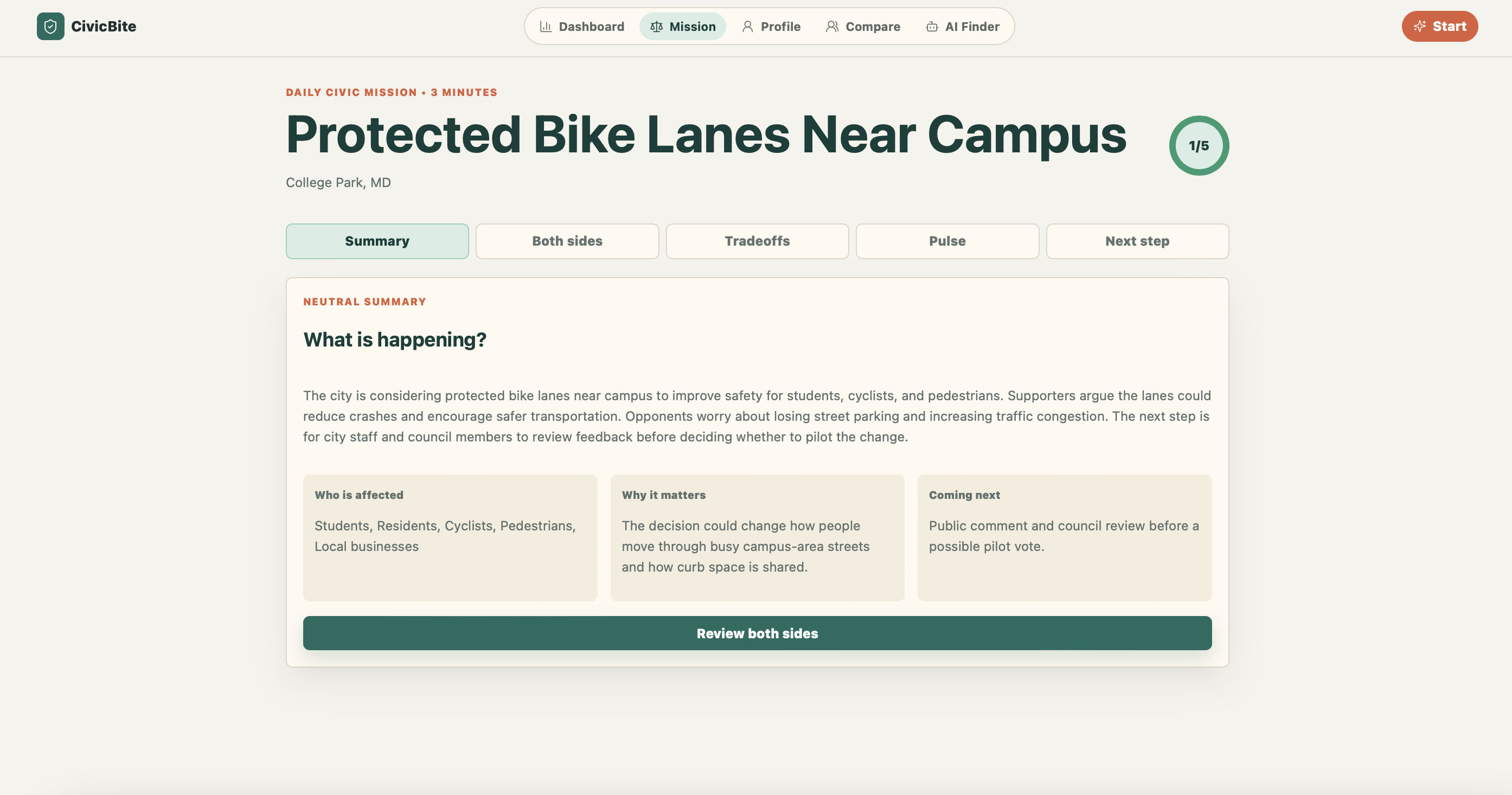CivicBite turns local government — usually buried in 80-page PDFs and 2-hour council meetings — into 90-second civic missions. Users get an AI-generated plain-English summary of a real local issue (zoning changes, school board votes, transit funding), see arguments from both supporters and opponents side-by-side, then work through a tradeoff question that surfaces what they actually value (e.g., "Lower property taxes or more parks funding — which matters more?"). Each mission builds out their civic profile, which tracks not just opinions but the underlying values driving them. At the end, they can send an editable public comment that goes from draft to submitted in under a minute.