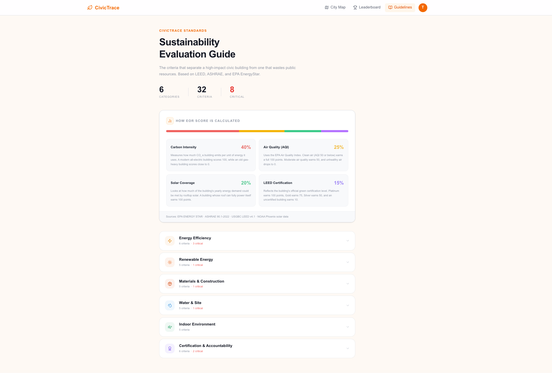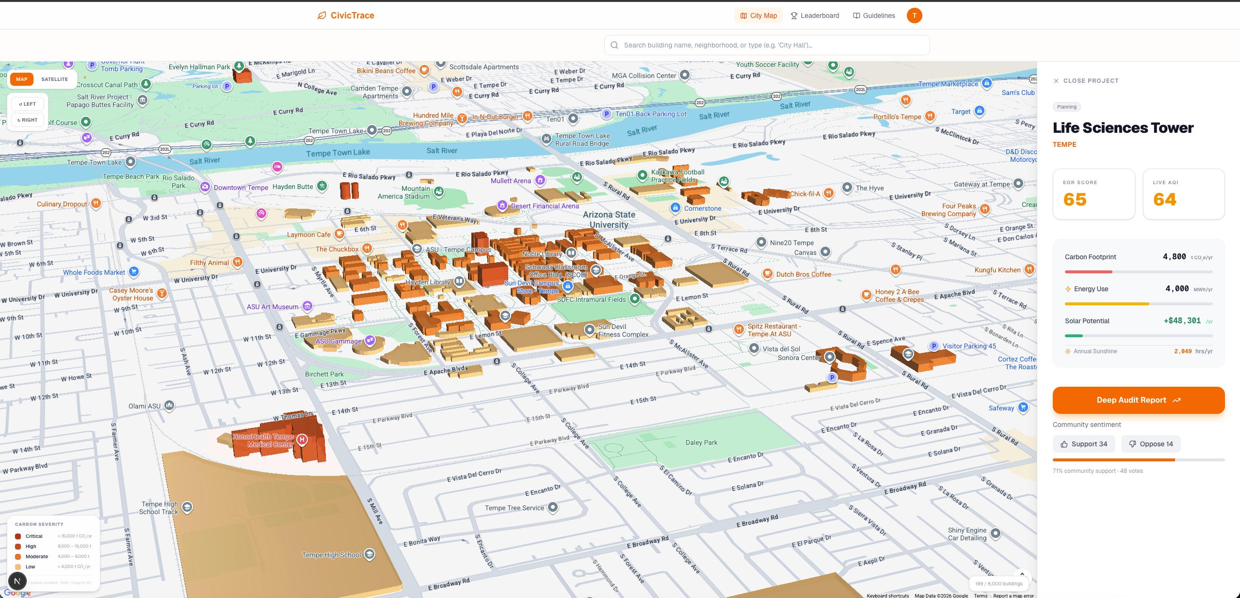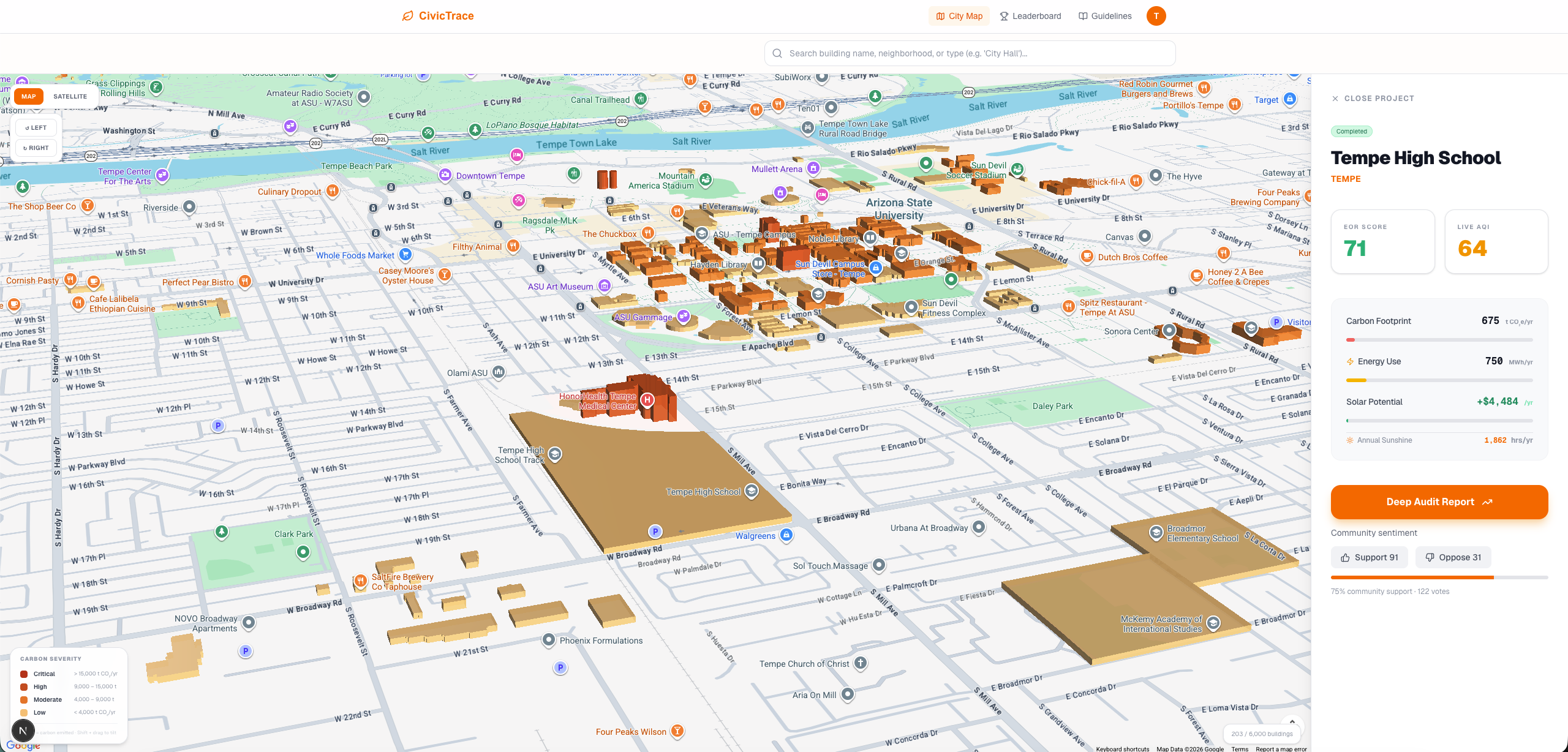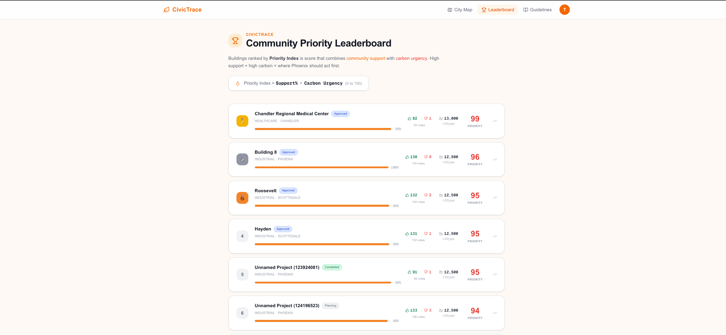 Community Priority Leaderboard Residents can vote on which buildings they most want to see go green. Buildings are ranked by a Priority Index community support percentage multiplied by carbon urgency score. This creates a data-backed, community-validated list of where Phoenix should act first: a policy roadmap built from civic participation.