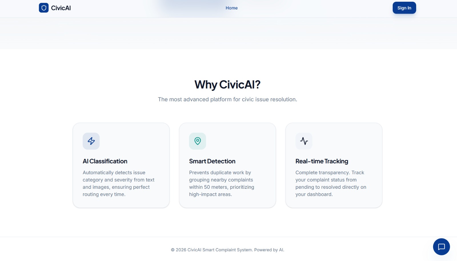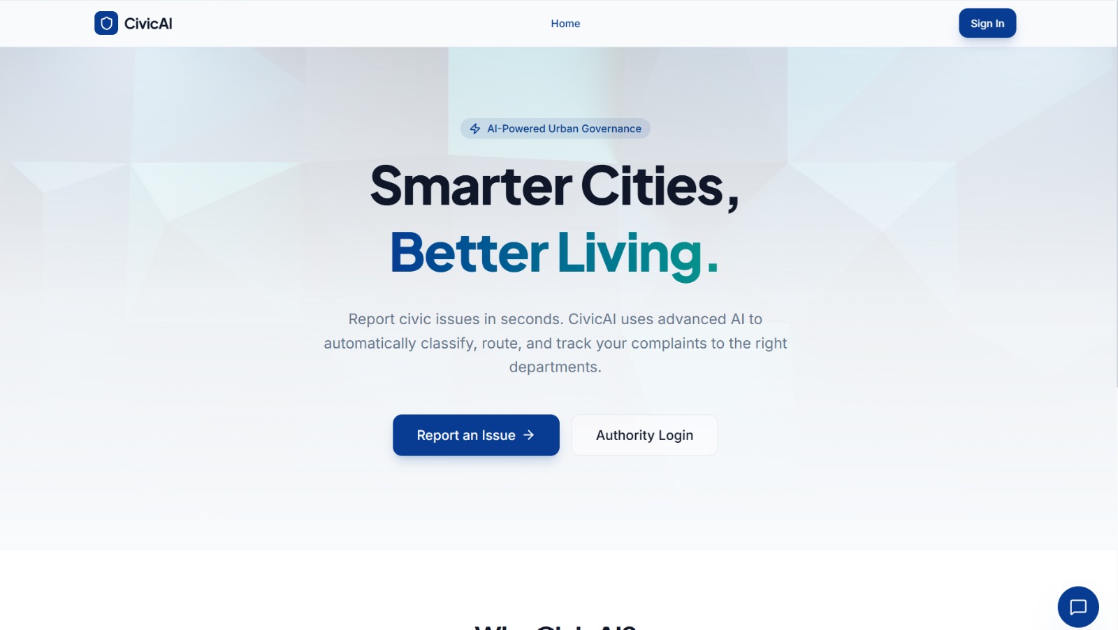 The reality is, many civic issues go unresolved because people either donโt report them, donโt know where to report them, or their complaints get ignored or duplicated. This gap between citizens and authorities inspired us to build CivicAI โ a platform that makes reporting issues simple, smart, and impactful.
