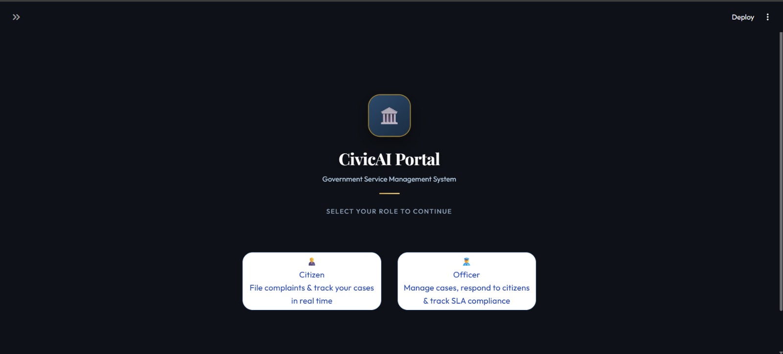 •Smart AI Triage — Gemini 2.5 Flash handles routine queries automatically, only escalating cases that genuinely need a human officer •SLA Enforcement — Cases are assigned deadlines based on priority (Critical: 30 min → Low: 5 days) with live breach alerts •AI Copilot for Officers — Each escalated case comes with a Gemini-generated summary, citizen profile, recommended action, and feedback loop •Case History & Tracking — Citizens can sign in to view all past cases and their statuses in one place •Role-Based Access — Separate, secure portals for citizens and officers with sign-up, sign-in, and guest access •Polished UI — Custom typography (Playfair Display + Outfit), animated role-selection screen, consistent design system across both portals •Feedback Loop — Officers can rate AI suggestions, helping measure escalation accuracy and copilot quality over time