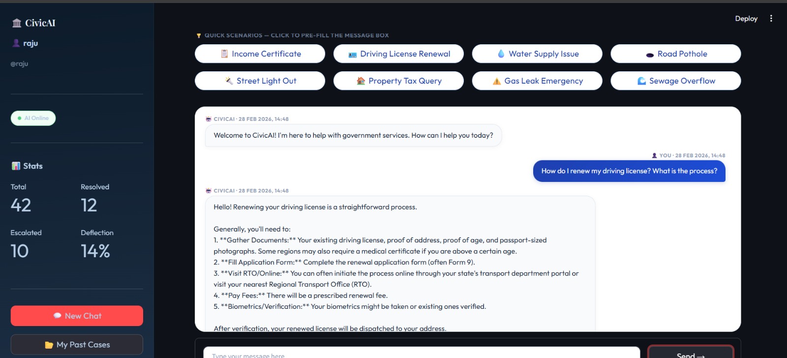 CivicAI bridges the gap between citizens and government officers with a two-portal system powered by Google Gemini AI: