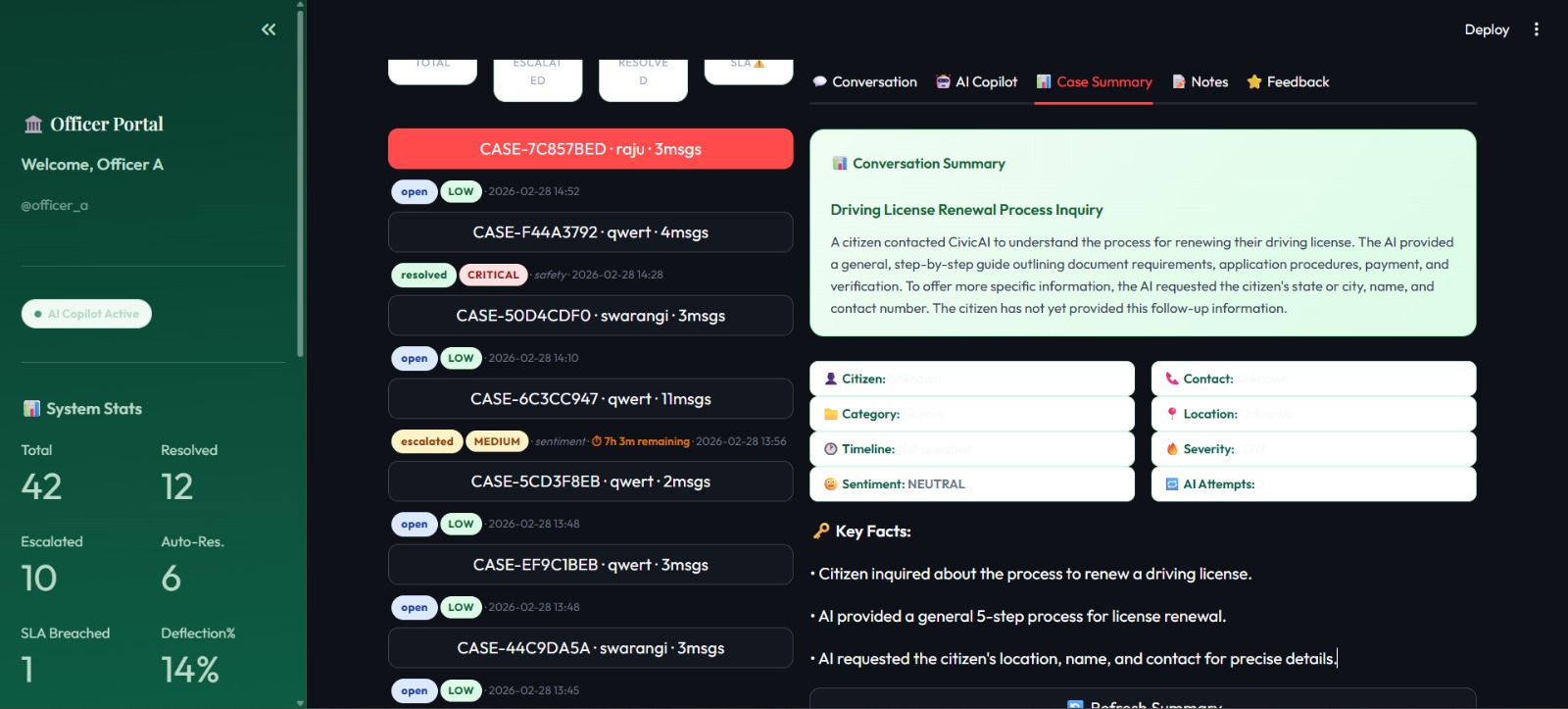 •Citizen Portal — Citizens can file complaints via a conversational AI chatbot that understands their issue, collects details, and either resolves it instantly or escalates it to the right officer with full context. •Officer Dashboard — Officers get a real-time dashboard with AI-generated case summaries, priority rankings, SLA countdown timers, a search system, and an AI Copilot that suggests recommended actions for every escalated case.