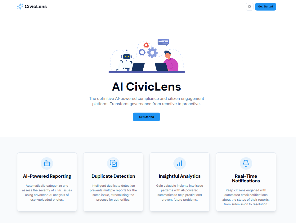 CivicLens AI is an AI-powered mobile application that allows users to upload photos of civic problems (e.g., damaged roads, litter). Using computer vision, it identifies and categorizes the issue, geo-tags the location, and sends the report to local authorities. Users can track the status of their reports in real-time, fostering accountability.