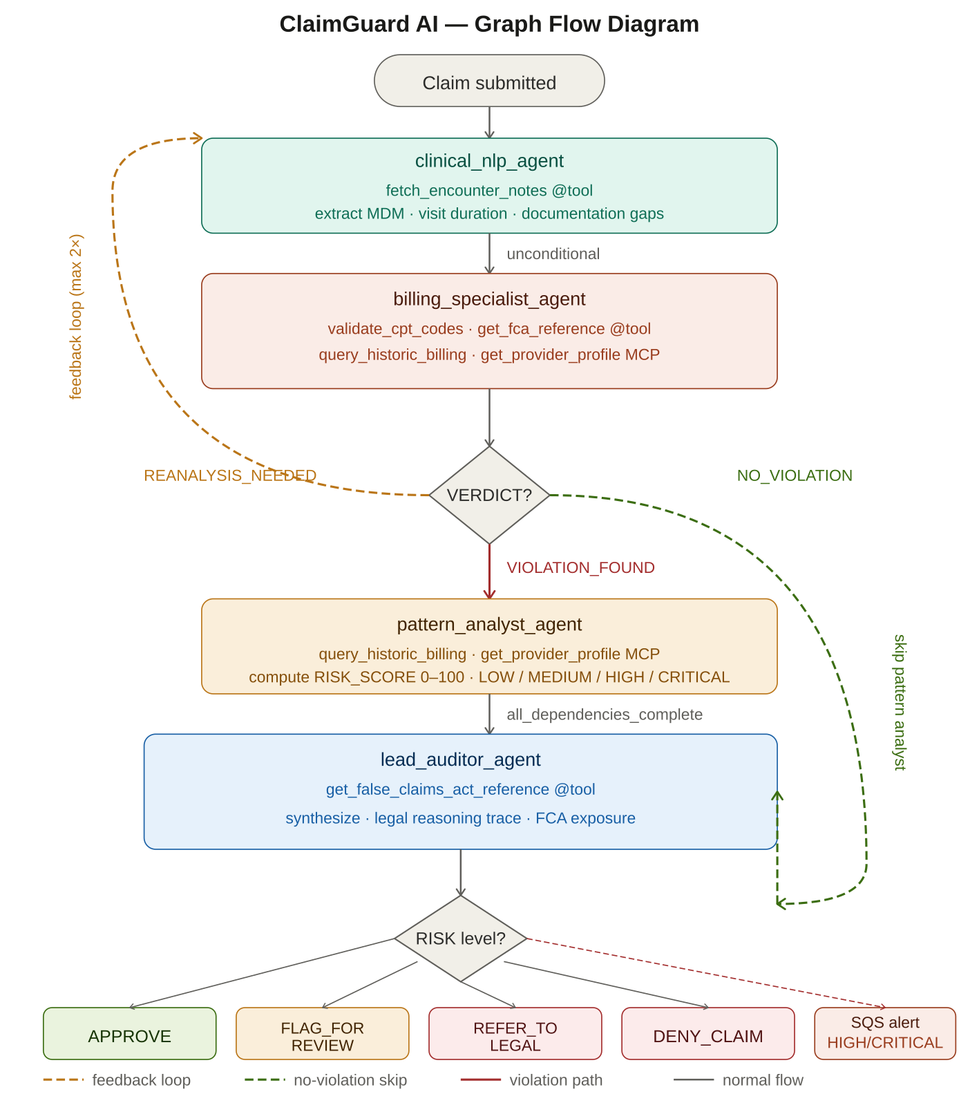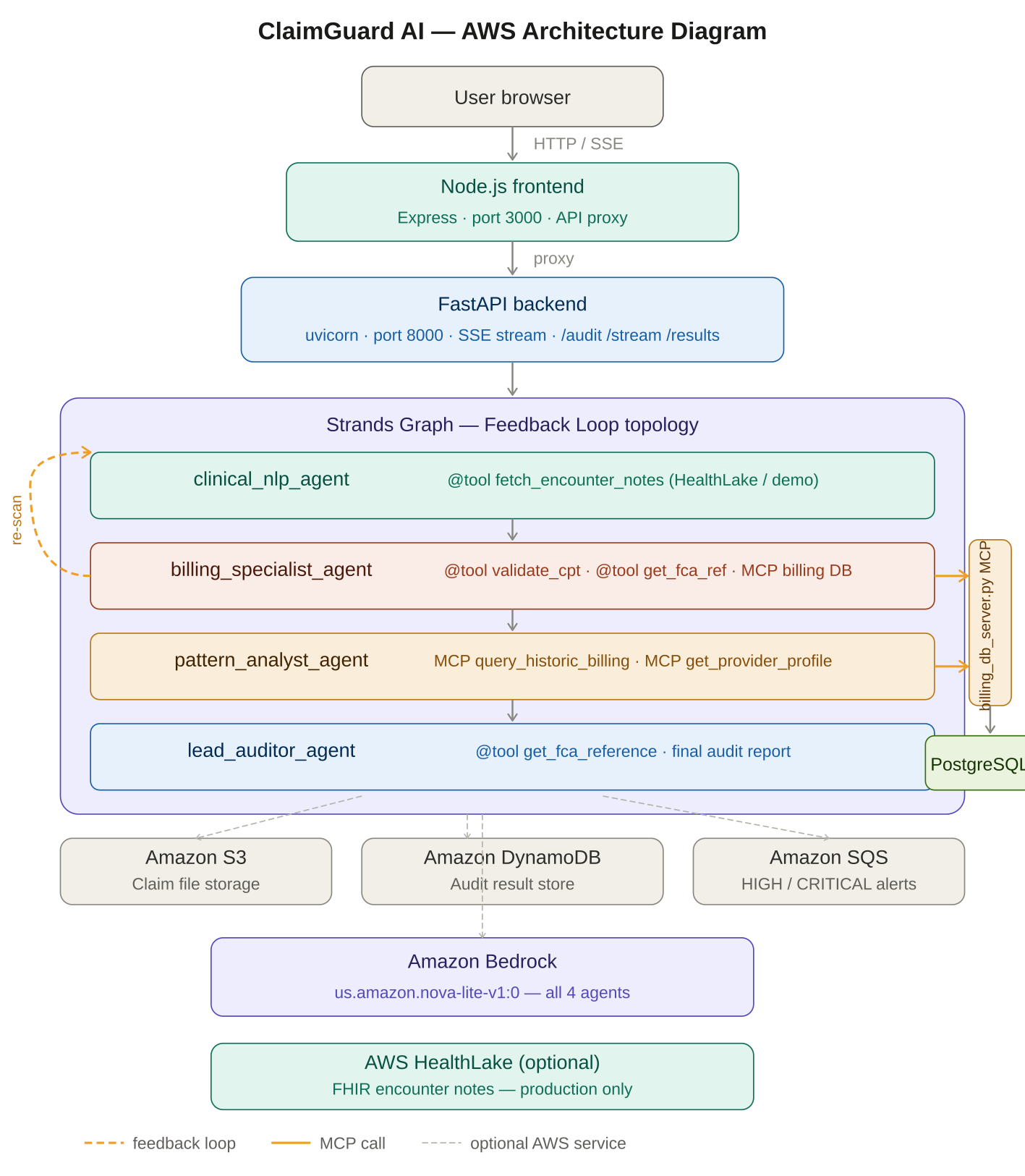 Healthcare fraud costs the US $300 billion a year. Human auditors can review 1% of claims. ClaimGuard AI audits 100% — it reads handwritten doctor notes, wound photos, and FHIR medical records together using Amazon Nova 2 Lite, then runs four specialist AI agents in a legally defensible chain. When evidence is ambiguous, it loops back and asks a sharper forensic question before reaching a verdict. It does not rush to accuse — it verifies first. That makes it safe enough to trust with real claims and real doctors.
