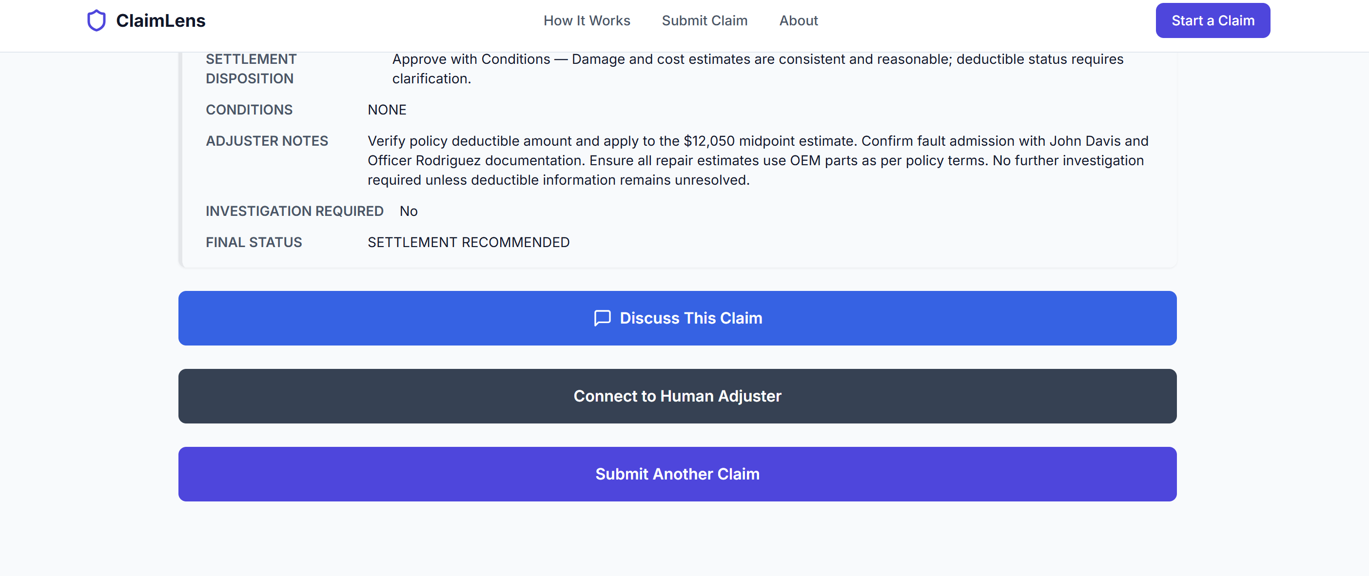 The platform produces a structured, adjuster ready settlement report that can be downloaded directly after processing. A Discuss This feature opens an AI chat interface that allows users to ask contextual questions about their specific claim based on the structured outputs generated by the agents. A Connect to Human Adjuster option allows the user to email customer service for manual review if needed.