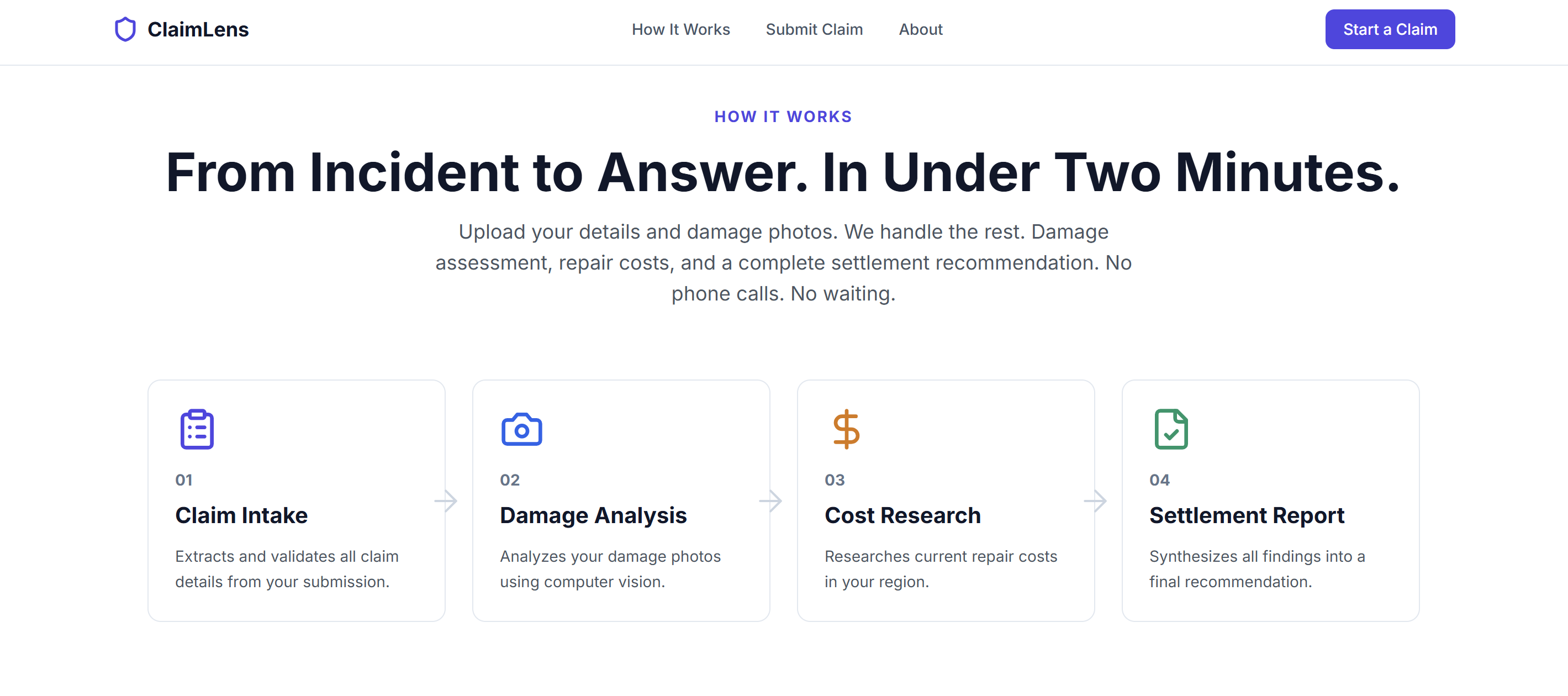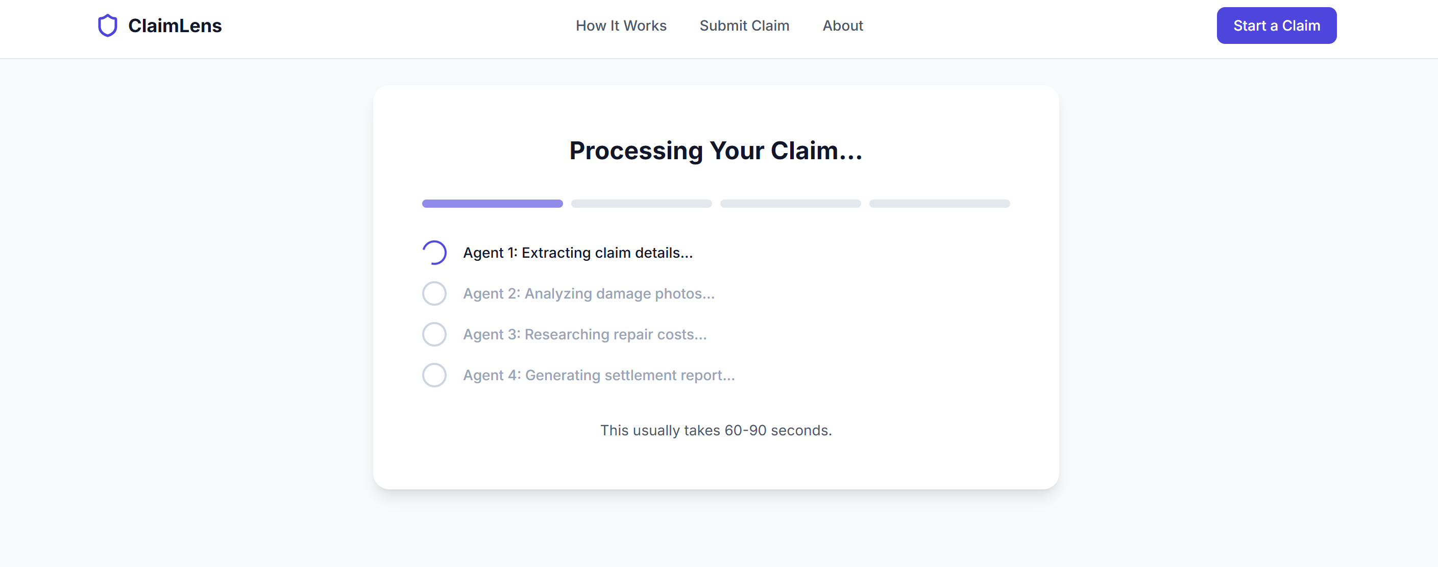 ClaimLens demonstrates a complete end to end multi agent claims processing pipeline that produces a settlement ready report in under two minutes. The system showcases practical enterprise application rather than a simple conversational interface.
