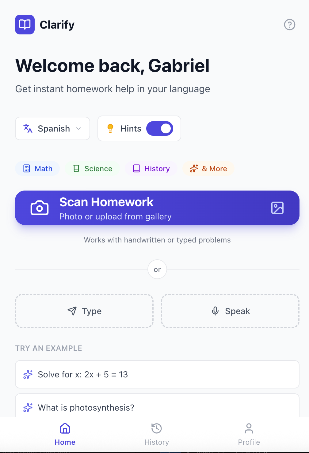 Clarify is an AI-powered study assistant that helps students understand their assignments in their preferred language. Students can snap a photo of their homework, type a question, or speak directly to the app.