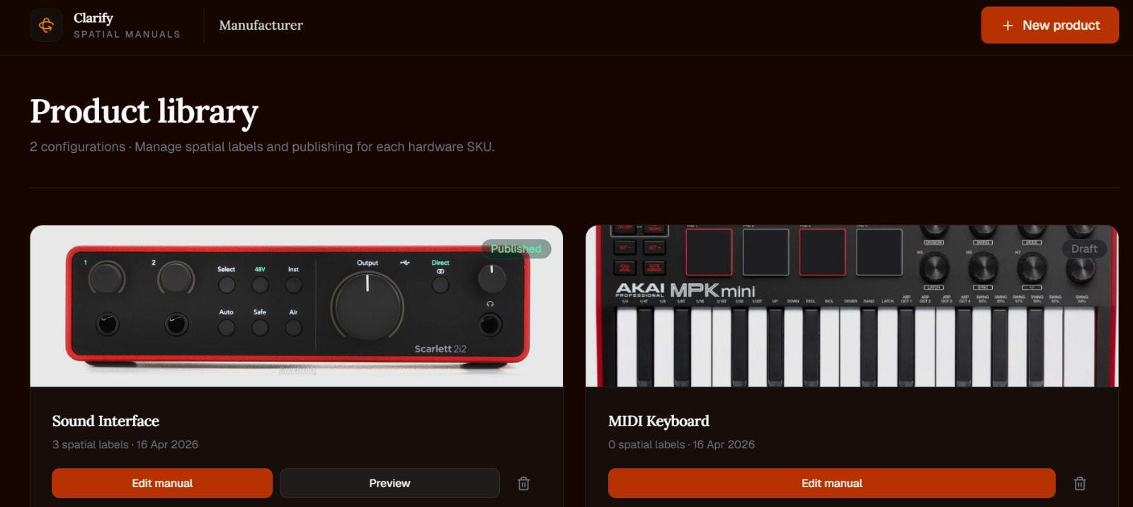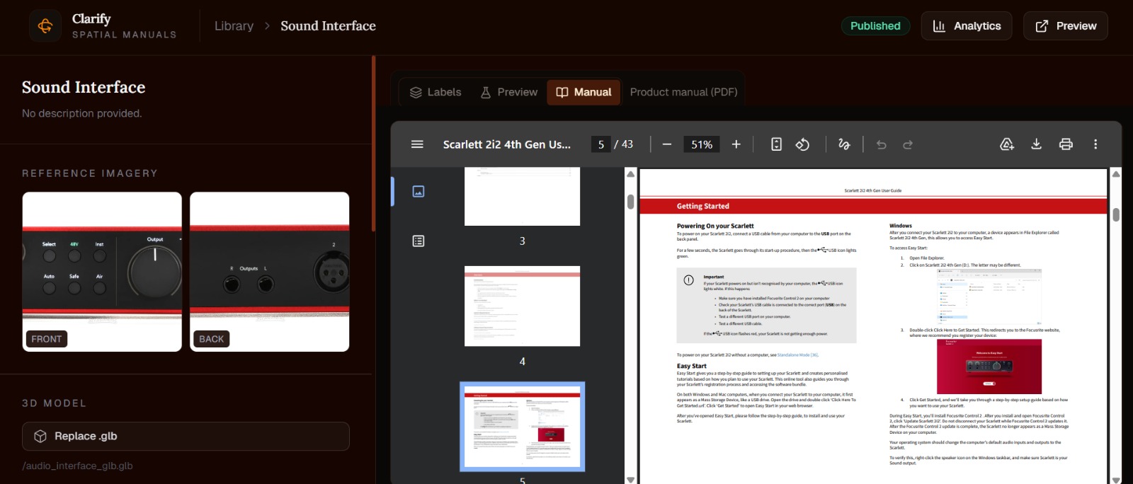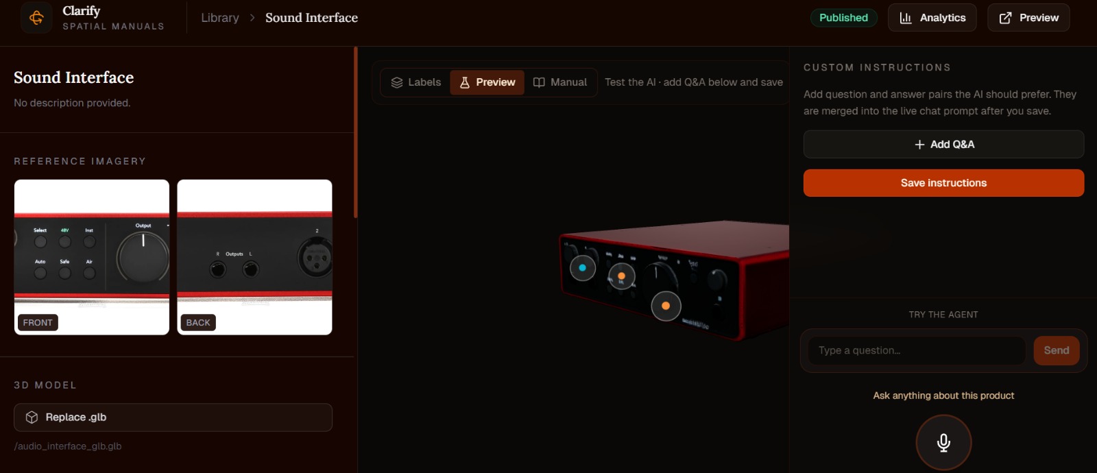 - Upload and Auto-Gen: The product manager logs into the Clarify dashboard, clicks "New Product," and uploads standard 2D reference photos alongside the PDF manual. The platform instantly auto-generates the 3D digital twin via Tripo3D.