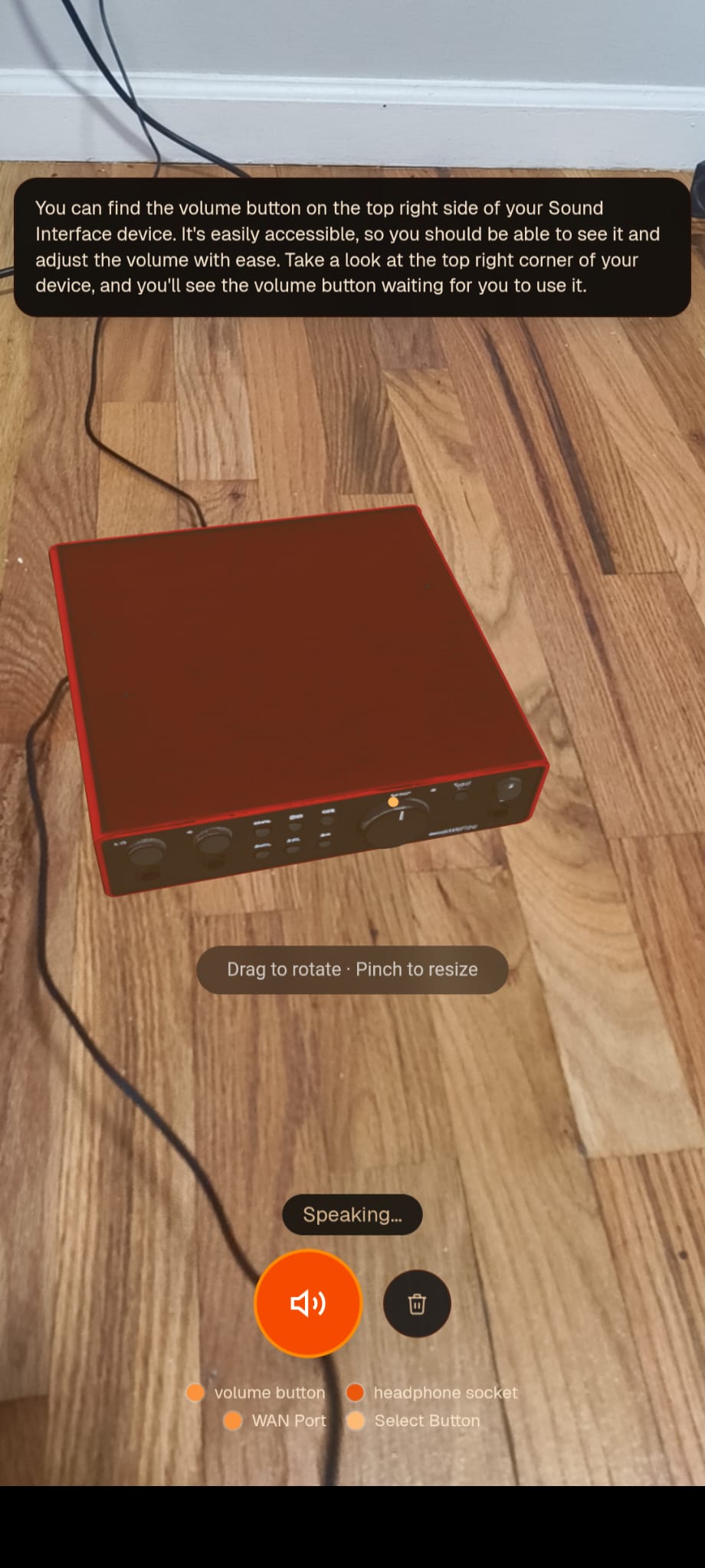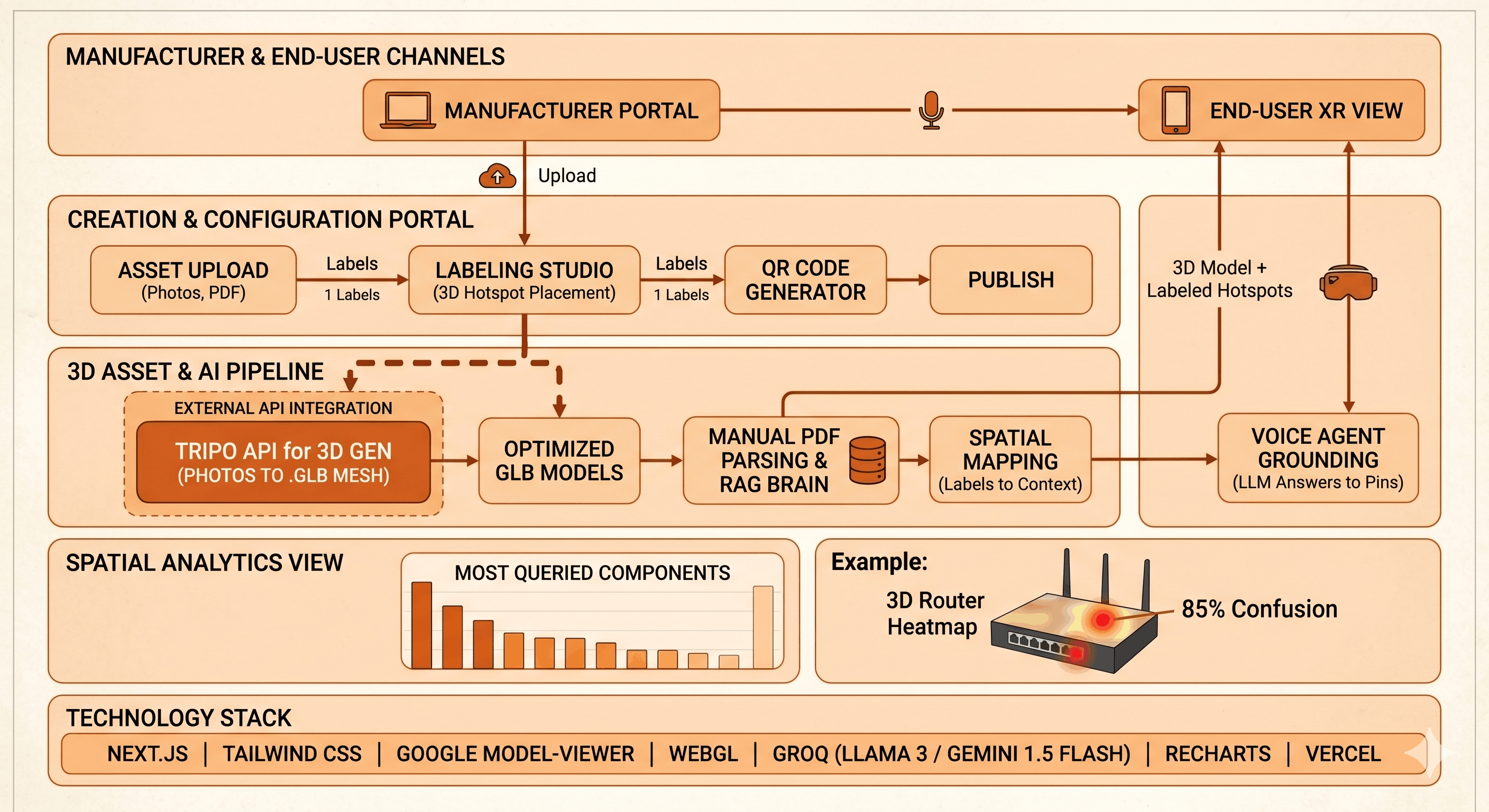 - Spatial Resolution: The Groq-powered Voice AI reads the manual in milliseconds, responds aloud via text-to-speech with the correct instructions, and physically illuminates the specific "Volume Button" hotspot on the AR model right in front of them.