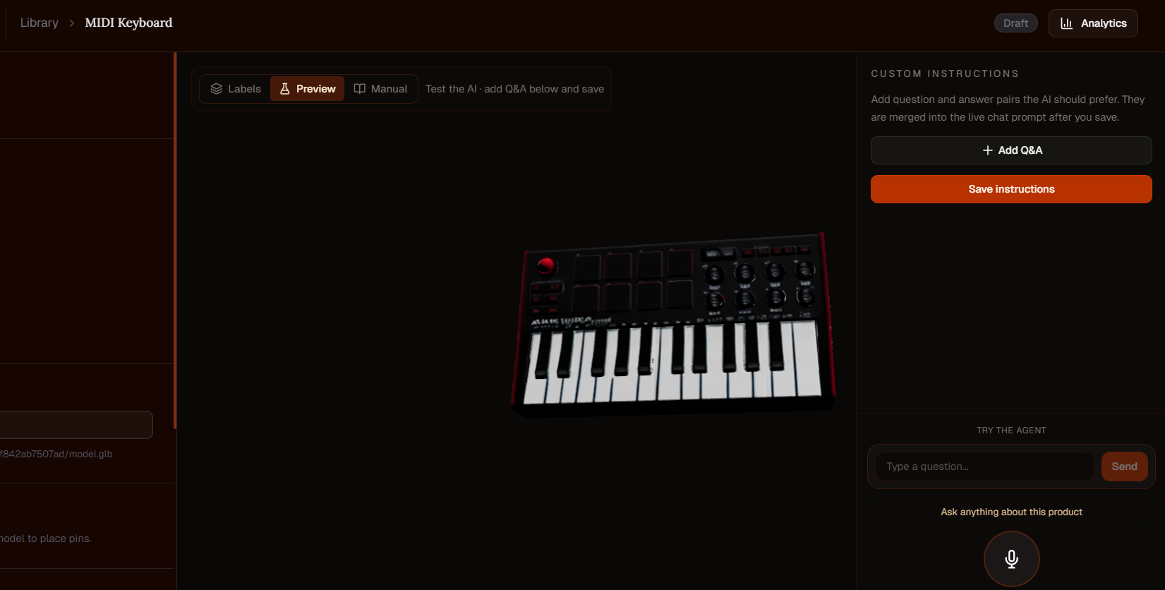 - Spatial Annotation: Inside the Labeling Studio, the manager clicks directly on the 3D mesh to drop pins on key features (e.g., naming a pin "Volume Button"). These labels are used by the Voice Agent to annotate and clarify information for the end user.