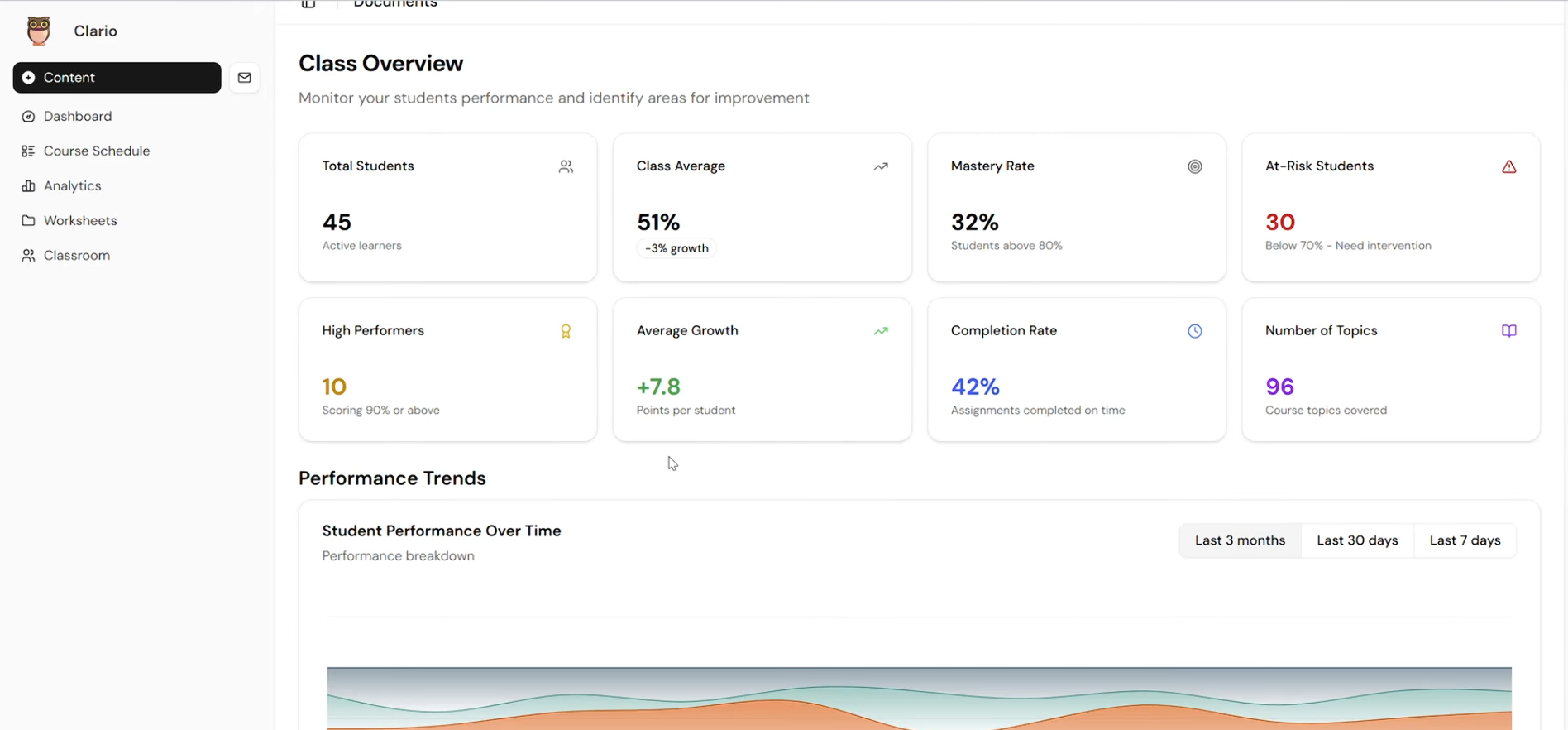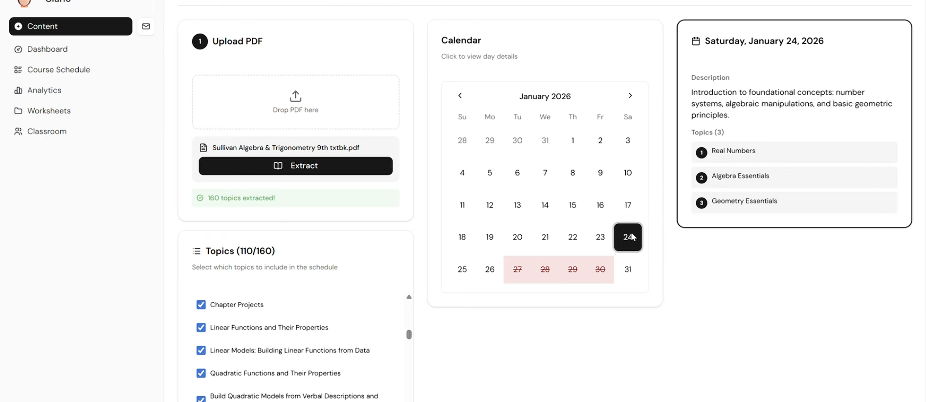 The app helps teachers on a daily basis track their course schedule. At the beginning of the year, teachers can upload all the textbook content, lecture slides, etc., and Gemini AI will generate a curated course schedule over the course of the assigned dates, accounting for hurricane holidays and any other sudden changes, where you can quickly curate the plan in seconds. For each concept on each day, the AI will also create a worksheet for each topic based on the concept provided. On top of all these features, the platform creates a detailed analysis of each student's data, scores, and performance, and flags any student that is falling behind.