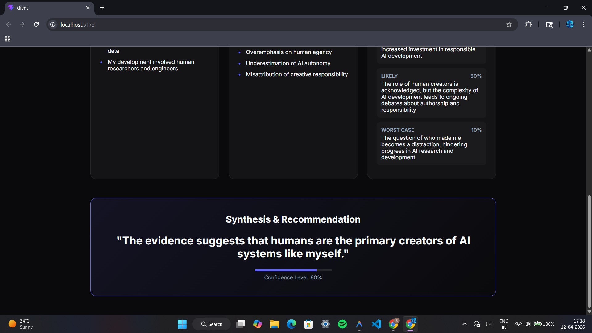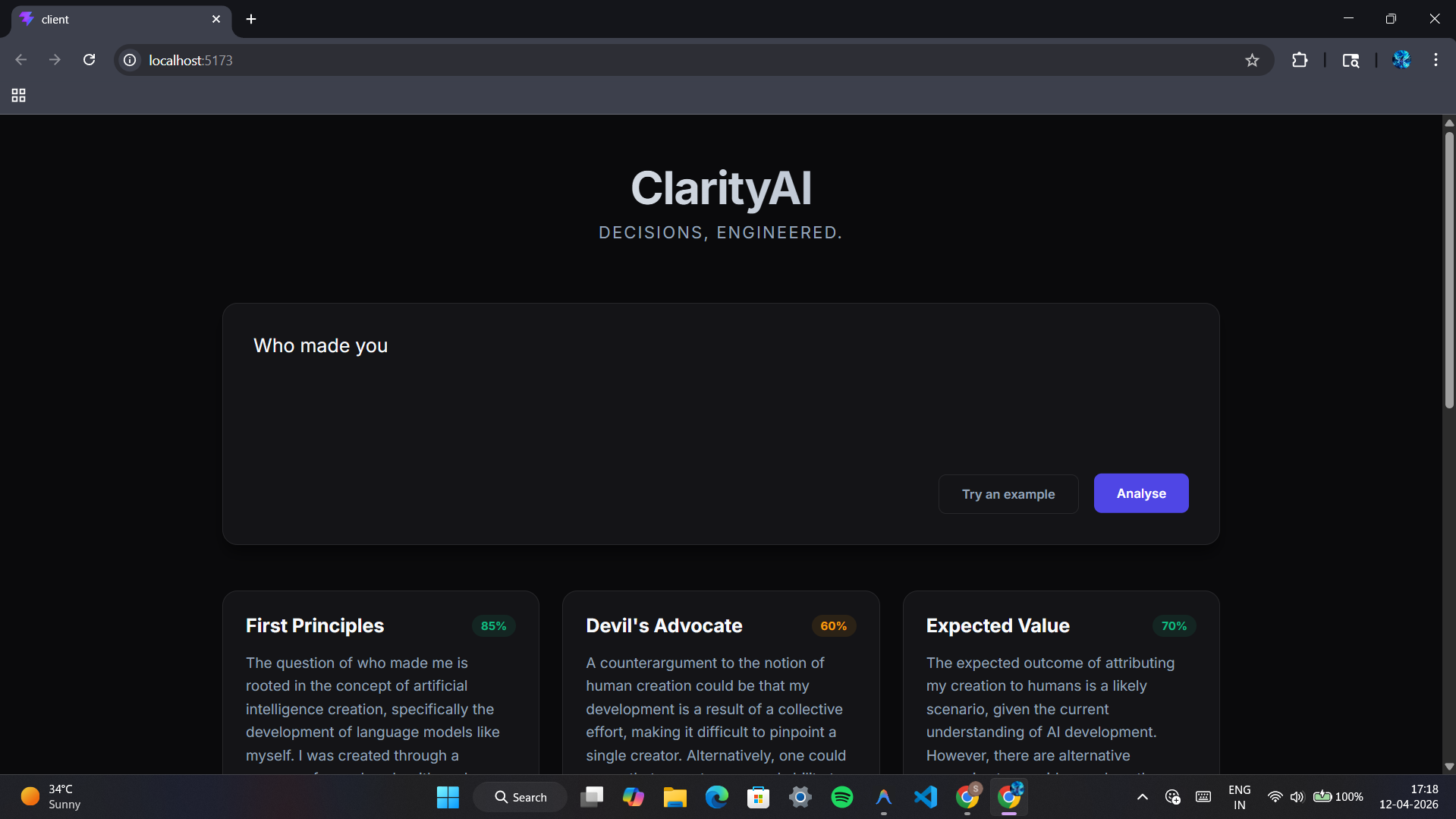 Description / About the project: Every important decision gets made with incomplete thinking. People either overthink emotionally or underthink logically. There's no structured way to pressure-test a decision from multiple angles before committing. ClarityAI solves this by analysing any decision through three frameworks simultaneously — First Principles, Devil's Advocate, and Expected Value — and delivering a structured dashboard with scores, scenario breakdowns, and a final recommendation with confidence level.