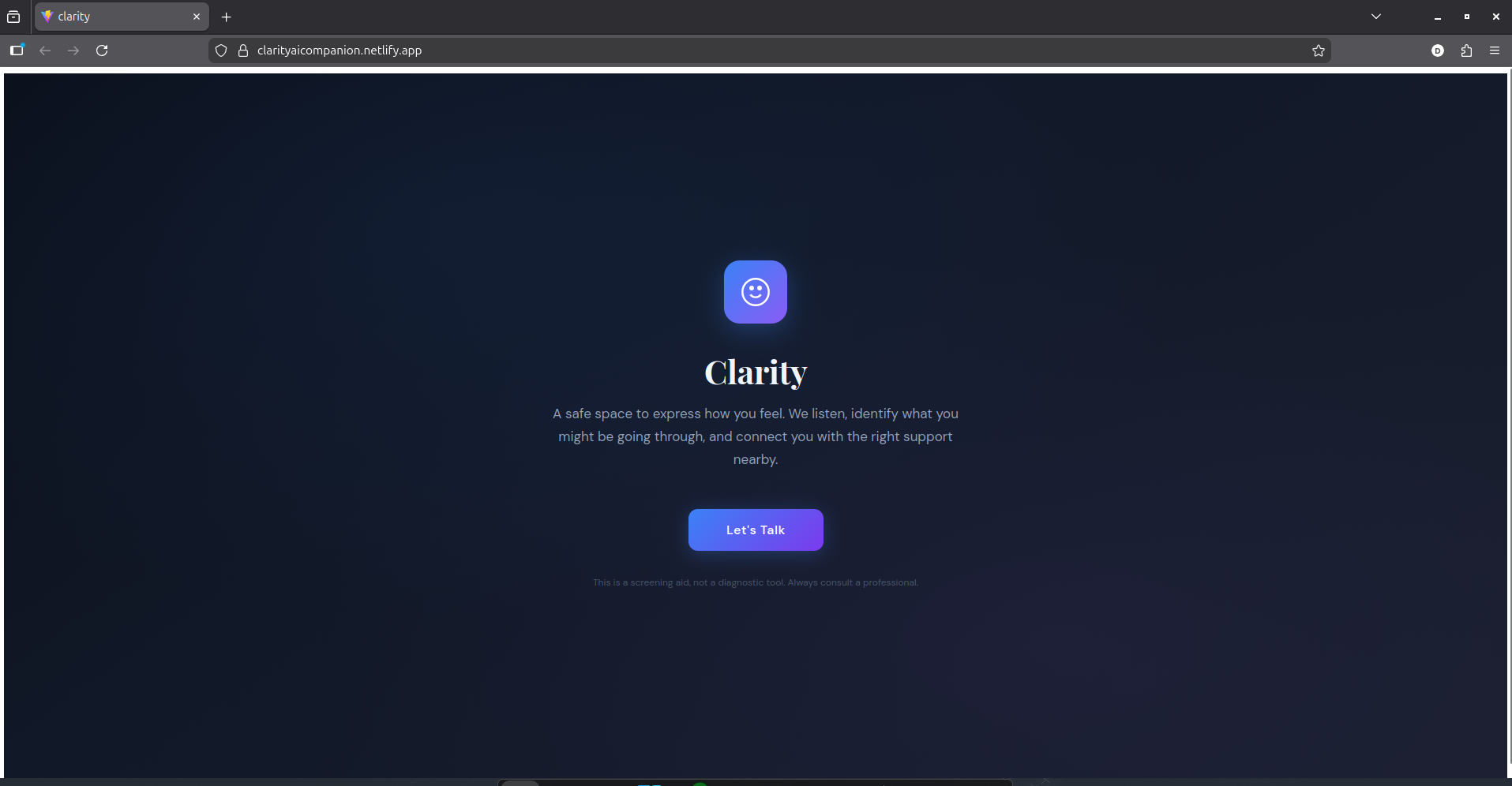 Clarity is an AI-powered mental health journaling platform that helps users reflect privately and track emotional patterns over time. The app analyzes journal entries and mood logs to detect trends, recurring stressors, and behavioral changes. When needed, it generates structured, GP-ready summaries that organize symptom frequency, duration, and triggers into a clear format for medical appointments.