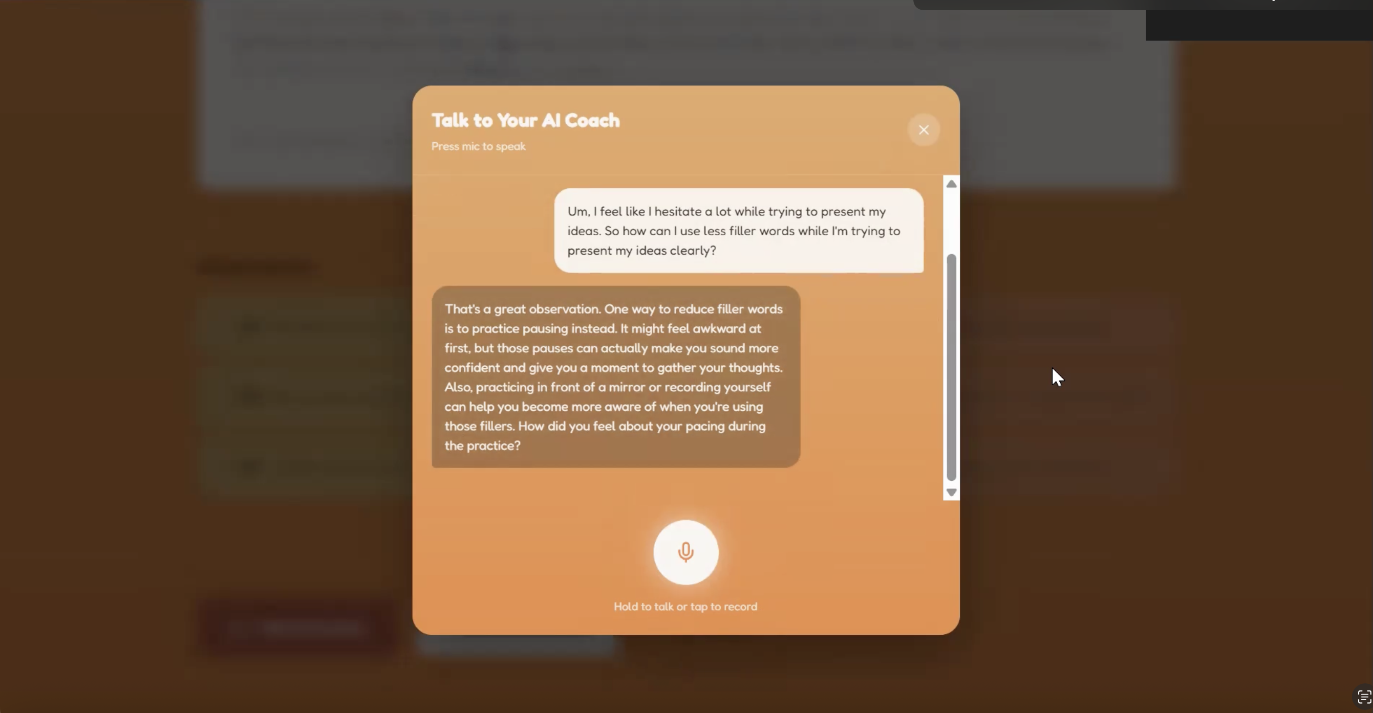 Clarity Coach lets users record a 45 second video of themselves and analyzes their posture, body language, eye contact, and speech. The website then provides users with a specialized analysis of their presentation, rating on posture, eye contact, clarity, and pacing. The user can ask specific questions relating to their performance and improvement to a human-sounding conversational AI. Finally, Clarity Coach tracks prior runs of recordings and saves them and respective stats to show user progress over time.