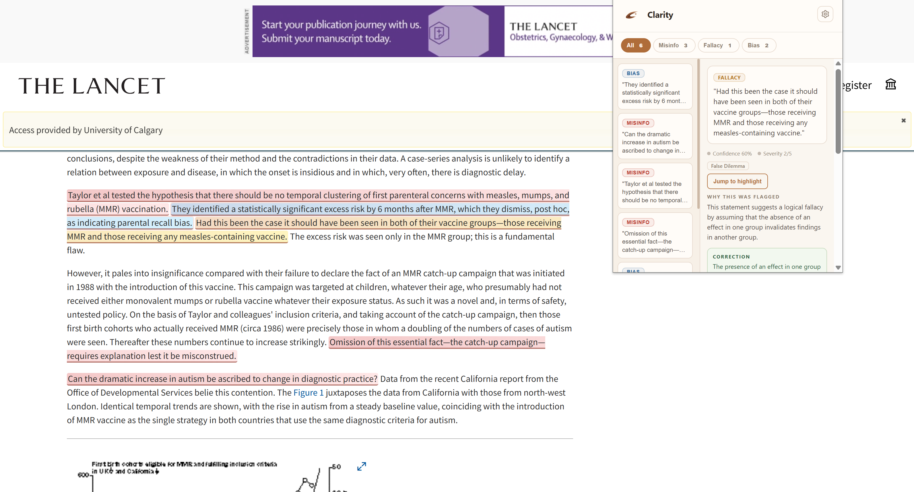 Clarity is a browser extension that works on both web pages and YouTube videos. It checks each sentence and verifies it with trusted sources, categorizing findings into three distinct tabs: Misinformation, Fallacies ,Bias Information. The purpose of this project is to make it easier for people to figure out the truth among the vast misinformation on the internet.