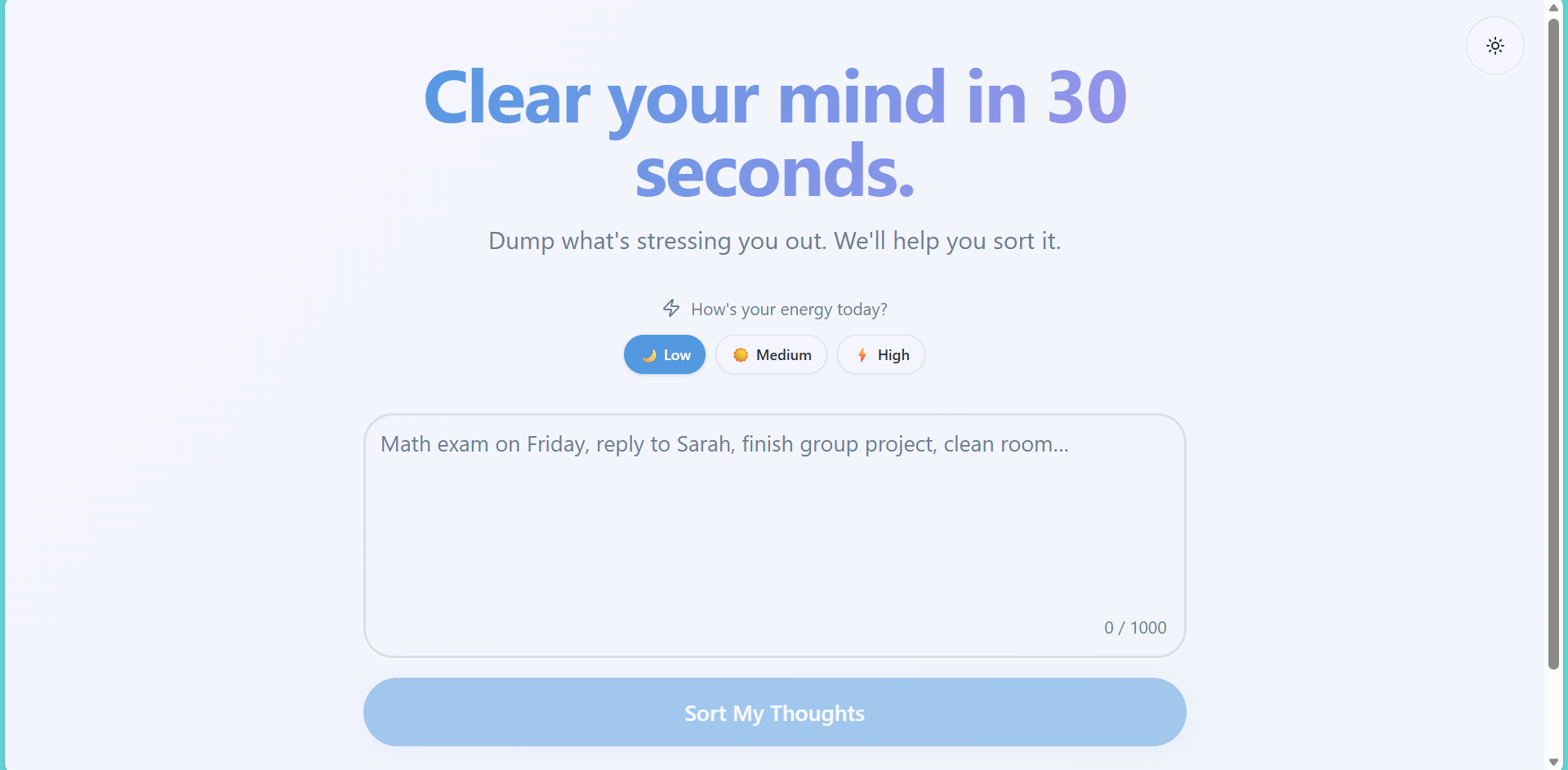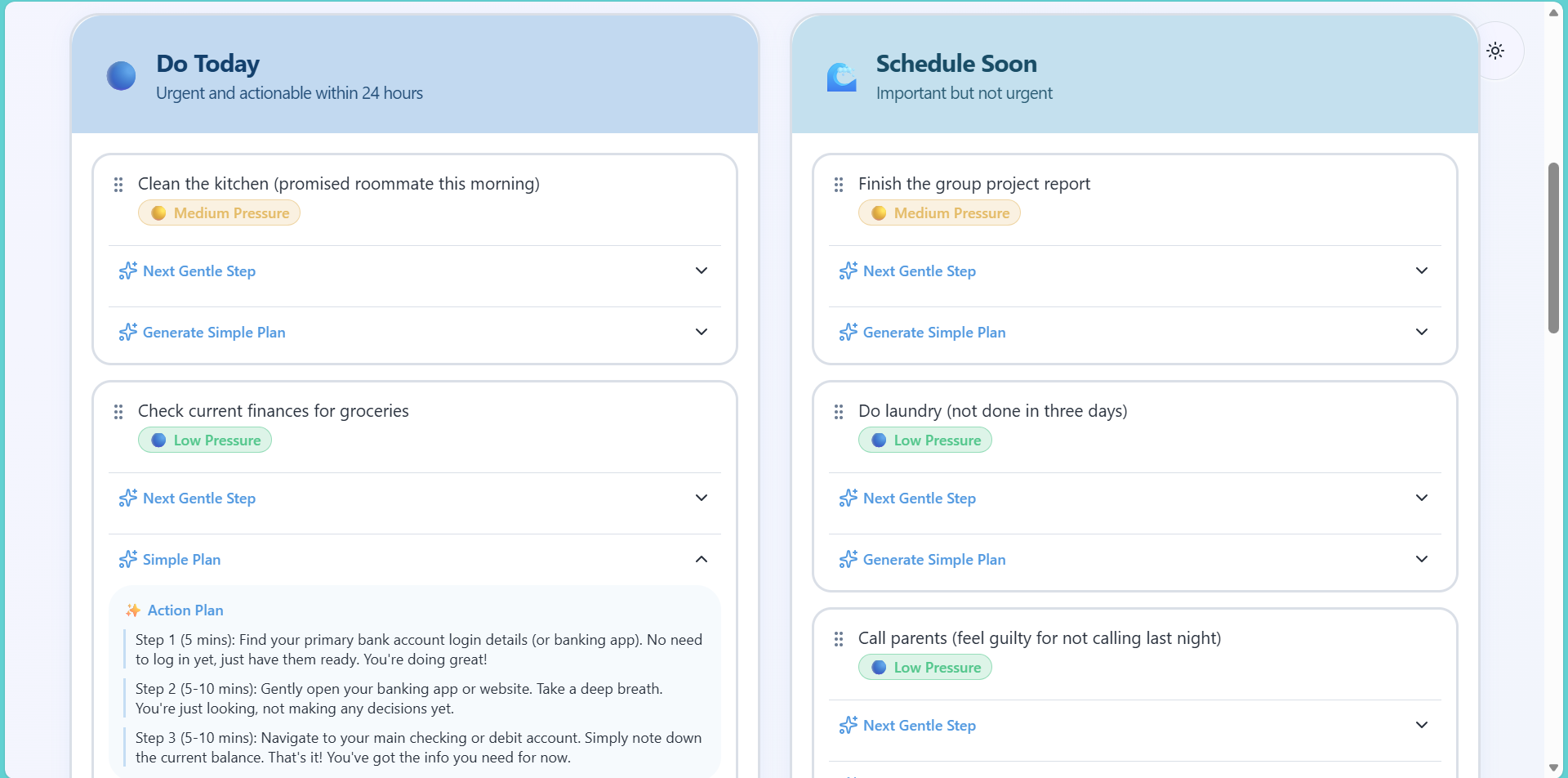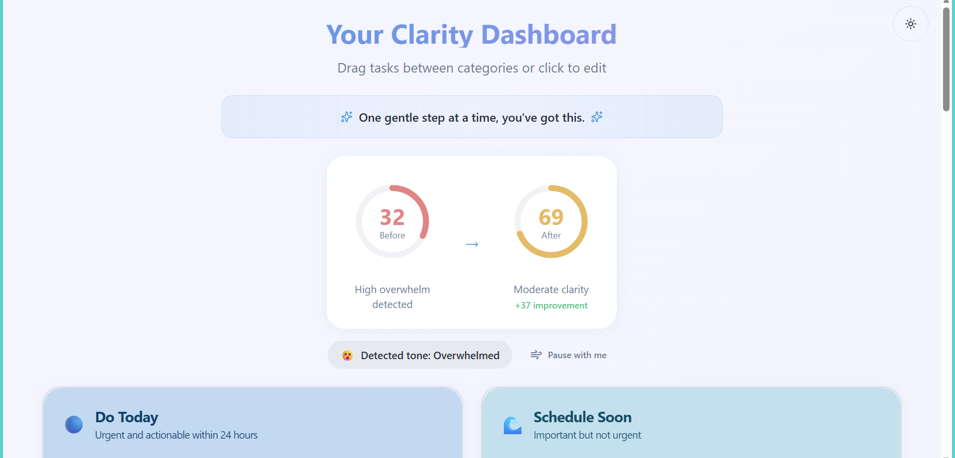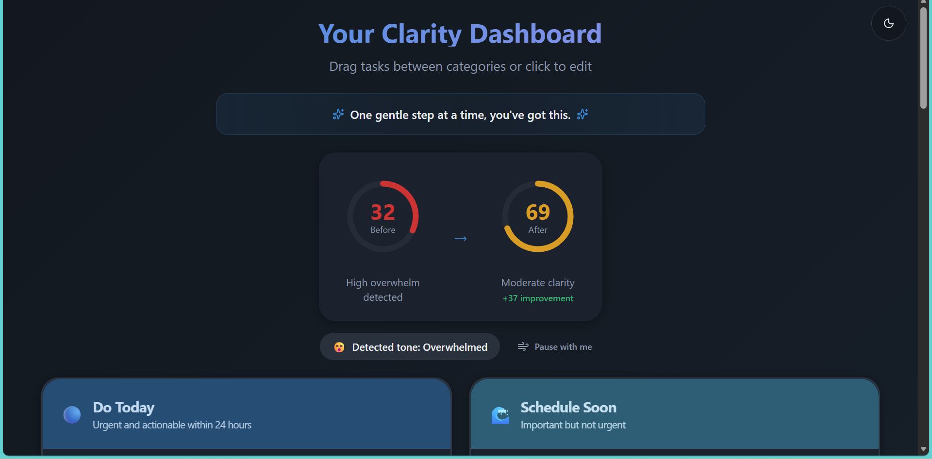 Users paste a free-form "brain dump" into the interface. A Large Language Model (LLM) processes the input and returns structured JSON with categorized tasks: