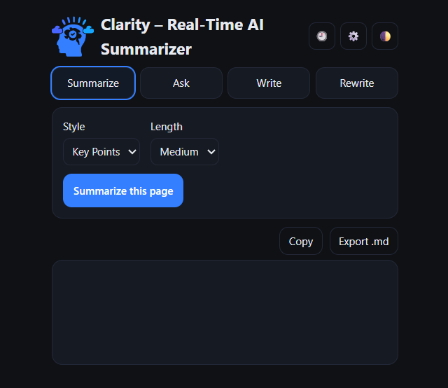 We built Clarity as a Manifest V3 Chrome extension with a FastAPI backend scaffold (later replaced fully by on-device models). The frontend is a polished, minimal popup with tabs for Summarize, Ask, Write, and Rewrite. Content extraction happens with smart scripting — grabbing either the article body or YouTube captions on demand. For the AI layer, we integrated Chrome’s Summarizer, Prompt, Writer, and Rewriter APIs, wrapping them with a clean UI and safe gesture handling.