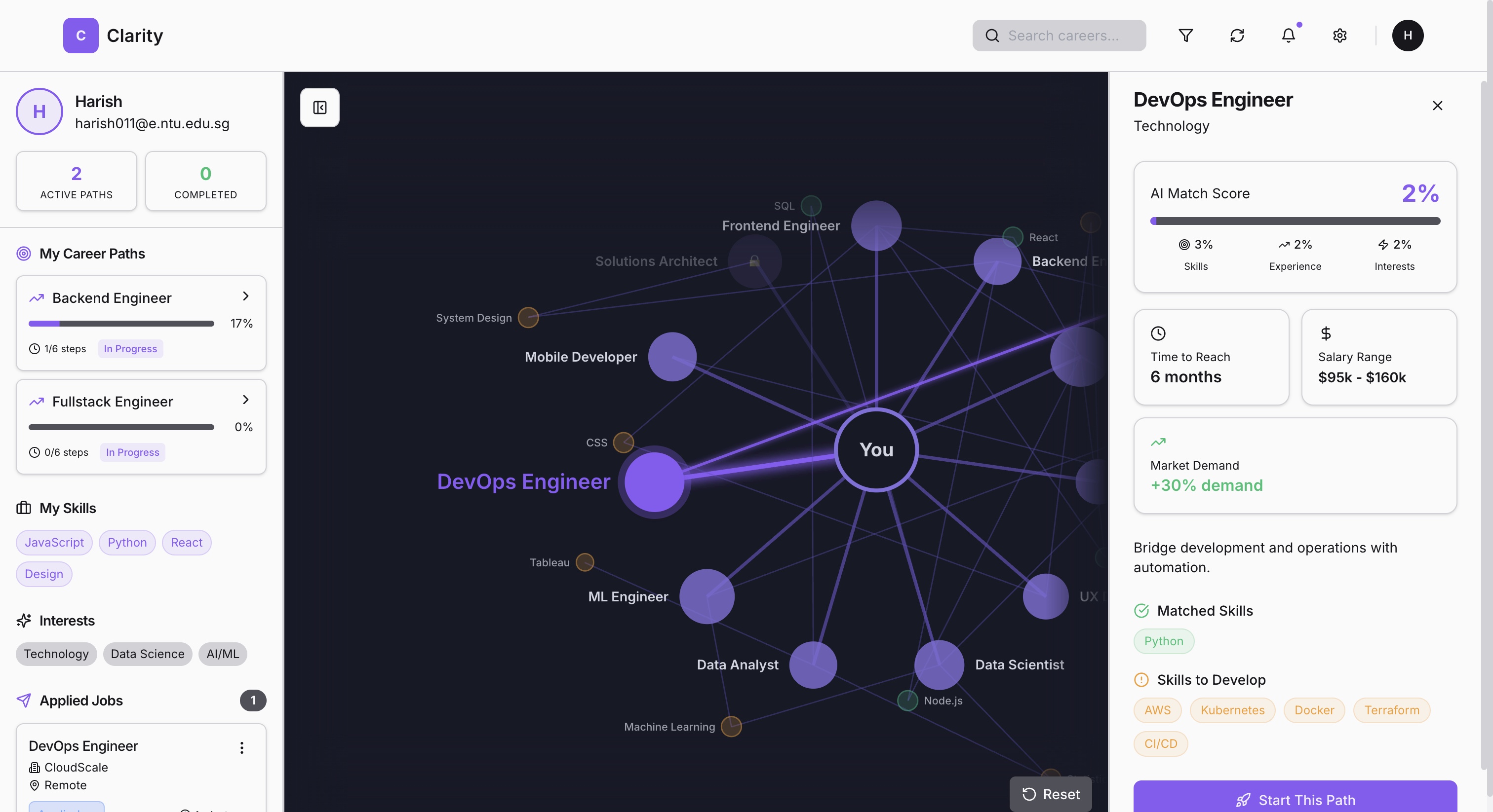 We built Clarity using a semantic matching pipeline: • Parsed resumes, LinkedIn profiles, and questionnaire responses. • Extracted skills, experience, and interests using NLP. • Embedded user and job data into vectors using the same embedding model. • Combined user features with a weighted fusion scheme (30% skills, 30% experience, 40% interests). • Stored users and jobs in vector form. • Computed cosine similarity to rank job recommendations. • Designed a UI that visualizes matches and surfaces AI-generated career roadmaps.